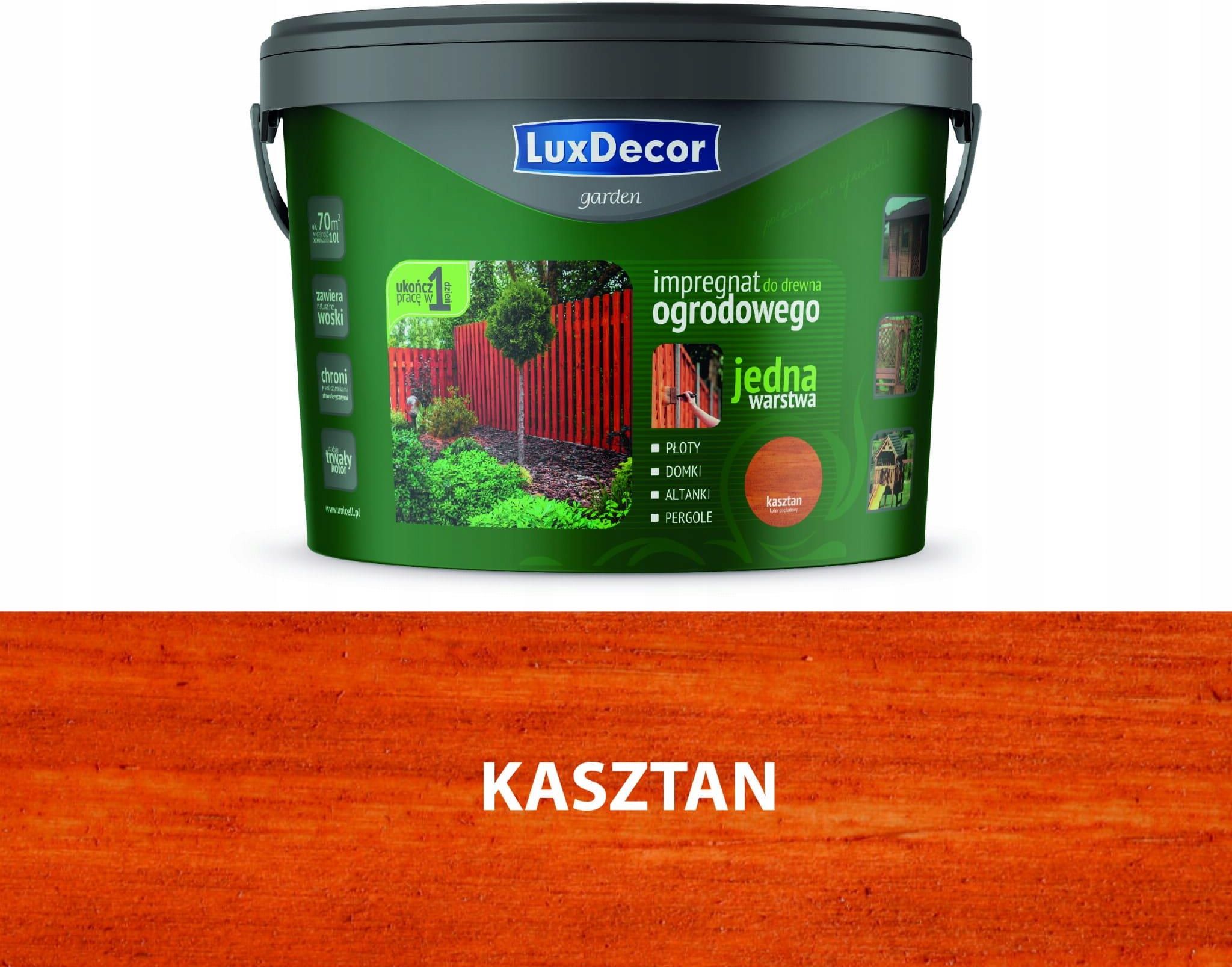 Luxdecor impregnat do drewna ogrodowego 9 l | kasztan Zadbaj o doskonałą kondycję Twojego drewna ogrodowego z naszym impregnatem do drewna z serii Garden, ekologicznym preparatem, który oferuje trwałą ochronę oraz nadaje estetyczny wygląd Twoim elementom zewnętrznym. Przygotowany z myślą o najwyższych standardach ochrony, ten impregnat to więcej niż zwykły środek – to gwarancja trwałości i piękna w każdych warunkach. Impregnat LuxDecor Garden jest odpowiedzią na potrzeby wszystkich, którzy poszukują nie tylko skutecznej ochrony, ale także sposobu na podkreślenie naturalnego piękna drewna. Jego główne zalety to: Jednowarstwowe malowanie Dzięki nowoczesnej formule, impregnatu LuxDecor Garden nie trzeba nakładać wielokrotnie, aby uzyskać trwałą ochronę i estetyczny efekt. Wystarczy jedna warstwa, by drewno było odpowiednio zabezpieczone przed wilgocią, grzybami i promieniowaniem UV. To ogromna oszczędność czasu i pracy – zwłaszcza w przypadku dużych powierzchni, takich jak altany, pergole, meble ogrodowe czy płoty. Ekologiczny skład Impregnat spełnia restrykcyjną normę PN-EN 71-3, co oznacza, że nie zawiera substancji szkodliwych dla zdrowia. Można go stosować bez obaw o bezpieczeństwo domowników, dzieci i zwierząt. Jest niskozapachowy, co czyni aplikację bardziej komfortową, a jego ekologiczna receptura sprawia, że nie wpływa negatywnie na otoczenie. Idealny wybór dla tych, którzy dbają o środowisko i preferują produkty wolne od toksycznych składników. Odporność na warunki atmosferyczne Drewno pozostawione na zewnątrz jest narażone na deszcz, śnieg, mróz i intensywne promieniowanie słoneczne. LuxDecor Garden tworzy elastyczną, ochronną warstwę, która skutecznie blokuje wilgoć i zabezpiecza powierzchnię przed blaknięciem oraz uszkodzeniami spowodowanymi promieniami UV. Dzięki temu drewno nie pęka, nie łuszczy się i zachowuje estetyczny wygląd przez długie lata. Wnikanie w głąb drewna Unikalna technologia impregnatu gwarantuje głęboką penetrację struktury drewna. W przeciwieństwie do zwykłych powłok malarskich, które tworzą wyłącznie powierzchniową barierę, LuxDecor Garden wchłania się w drewno, chroniąc je od wewnątrz. Dzięki temu skutecznie zapobiega gniciu, rozwojowi pleśni i szkodnikom, wydłużając żywotność elementów drewnianych. Szybkie schnięcie Dzięki nowoczesnej formule, impregnatu nie trzeba długo suszyć – już po 2 godzinach powierzchnia jest sucha na dotyk, co minimalizuje ryzyko zabrudzeń czy przypadkowego uszkodzenia świeżo pomalowanego drewna. To idealne rozwiązanie dla osób, które chcą szybko ukończyć prace ogrodowe i cieszyć się pięknie zabezpieczonym drewnem bez długiego oczekiwania. Do czego można zastosować? LuxDecor Garden jest idealny do ochrony i dekoracji wszelkich drewnianych elementów używanych na zewnątrz, w tym: Płoty i ogrodzenia Pergole i altany Meble ogrodowe Sztachety i palisady Domki narzędziowe Place zabaw Sposób użycia Aplikacja impregnatu LuxDecor Garden jest niezwykle prosta i nie wymaga specjalistycznych umiejętności: Przygotowanie powierzchni: upewnij się, że drewno jest czyste, suche i wolne od jakichkolwiek zanieczyszczeń. Aplikacja: za pomocą pędzla, wałka lub spryskiwacza równomiernie nałóż impregnat na drewno. Schnięcie: pozwól impregnatowi wyschnąć, zapewniając odpowiednią cyrkulację powietrza. Specyfikacja produktu Pojemność: 9 litrów Wydajność: do 7 m²/l, zależna od chłonności drewna i techniki aplikacji Konsystencja: żel, który nie kapie i nie spływa, ułatwiający aplikację na powierzchniach pionowych Kolor: po wyschnięciu tworzy matowe wykończenie, które subtelnie podkreśla naturalny rysunek drewna Skład chemiczny: żywice, pigmenty, woski, środki pomocnicze Postać/kolor: półpłynna do galaretowatej konsystencja; dostępny w różnych kolorach zgodnie ze wzornikiem. Zapach: łagodny, specyficzny. pH: około 9,5. Gęstość: około 1 g/cm³. Sposób nanoszenia: pędzel lub wałek. Rozcieńczalnik: woda (produkt nie wymaga rozcieńczania; w razie potrzeby można dodać do 10% wody). Ilość warstw: zalecane 2 warstwy. Wydajność: do 20 m²/l, w zależności od rodzaju, chłonności i wykończenia drewna oraz grubości warstw. Czas schnięcia (dotykowy): 1 godzina. Czas schnięcia (całkowity): 12 godzin. Nanoszenie drugiej warstwy: po 1-2 godzinach od nałożenia pierwszej warstwy. Mycie narzędzi: woda z detergentem. Warunki aplikacji Temperatura pracy: powyżej 6°C. Wilgotność drewna: poniżej 15%. Przechowywanie Warunki: przechowywać w szczelnie zamkniętych, oryginalnych opakowaniach w temperaturze od 5°C do 30°C. Uwagi: nie przemrażać; przechowywać w suchym i przewiewnym pomieszczeniu. Bezpieczeństwo Informacje: produkt niepalny, nieklasyfikowany jako niebezpieczny. Zawiera mieszaninę 5-chloro-2-metylo-2H-izotiazol-3-onu i 2-metylo-2H-izotiazol-3-onu, co może powodować reakcje alergiczne. Zalecenia: podczas aplikacji stosować odzież ochronną; pomieszczenia wietrzyć do zaniku zapachu; przechowywać poza zasięgiem dzieci. Uwaga: Produkt posiada półpłynną, galaretowatą konsystencję, co jest jego naturalną cechą i nie oznacza utraty właściwości. Dlaczego warto wybrać LuxDecor Garden? Tylko jedna warstwa – szybkie i wydajne malowanie. Ekologiczna formuła – bezpieczna dla zdrowia i środowiska. Ochrona przed warunkami atmosferycznymi – drewno nie blaknie, nie gnije i nie pęka. Głębokie wnikanie w drewno – długotrwała ochrona od wewnątrz. Ekspresowe schnięcie – powierzchnia gotowa do użytku już po 2 godzinach. LuxDecor Garden to idealne rozwiązanie dla każdego, kto szuka łatwego w aplikacji, trwałego i ekologicznego impregnatu do drewna ogrodowego.