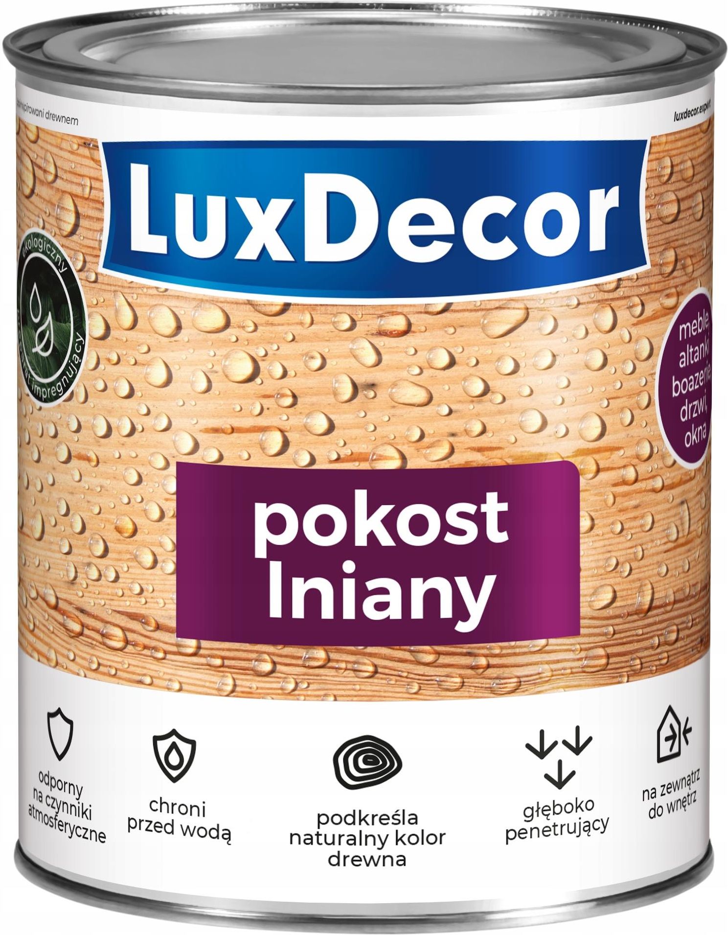 Pokost Lniany 700 ml bezbarwny Luxdecor Markowy produkt Luxdecor Pokost lniany Bezbarwny Głęboko penetrujący Podkreśla naturalny kolor drewna Chroni przed wodą Do wewnątrz I na zewnątrz Ekologiczny symbol: 029907 Opakowanie: 0,7 Wydajność: do 10m2/l Pokost lniany jest naturalnym, ekologicznym produktem do impregnowania każdego gatunku drewna. Charakteryzuje się wysoką odpornością na działanie warunków atmosferycznych oraz dobrą zdolnością penetracji każdego rodzaju podłoża. Dzięki swoim właściwościom chroni przed wilgocią, podnosi odporność na zarysowania i wypaczenia, ogranicza pękanie drewna i osiadanie zabrudzeń, wzmacnia strukturę i podkreśla rysunek słojów. Nadaje się idealnie do zabezpieczenia m.in.: mebli ogrodowych, domków letniskowych, altanek, boazerii, drzwi, okien czy lamperii. Zastosowanie: do wszystkich gatunków drewna krajowego i egzotycznego. Parametry techniczne Wydajność: 10 m2/litr Narzędzie: pędzel, gąbka Ilość warstw: 1-2 Schnięcie dotykowe: 6h Schnięcie całkowite: 24h Kolejna warstwa: 24 h Mycie narzędzie: woda z detergentem Zastosowanie: do wszystkich gatunków drewna krajowego i egzotycznego Pokost lniany jest naturalnym, ekologicznym produktem do impregnowania każdego gatunku drewna. Charakteryzuje się wysoką odpornością na działanie warunków atmosferycznych oraz dobrą zdolnością penetracji każdego rodzaju podłoża. Dzięki swoim właściwościom chroni przed wilgocią, podnosi odporność na zarysowania i wypaczenia, ogranicza pękanie drewna i osiadanie zabrudzeń, wzmacnia strukturę i podkreśla rysunek słojów. Nadaje się idealnie do zabezpieczenia m.in.: mebli ogrodowych, domków letniskowych, altanek, boazerii, drzwi, okien czy lamperii. UWAGA: Prezentowane barwy należy traktować jedynie poglądowo, gdyż na ocenę koloru wpływ mają np. ustawienia monitora (wyświetlacza, jasność/kontrast/temperatura barw), oświetlenie zewnętrzne.