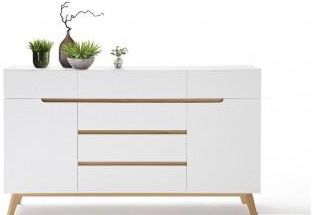 MC FURNITURE Komoda kolekcji CERVO Nowoczesna komoda CERVO inspirowana latami 60' wpisuje się doskonale także w styl retro. Wykonana została z MDF lakierowanego matowego z elementami naturalnego drewna i forniru dębowego Posiada sześć szuflad i dwoje drzwi z cichym domykiem. Mebel dostępny jest w paczkach do samodzielnego montażu , każdy mebel zawiera instrukcję montażu. WYMIARY: - długość: 169 cm - szerokość: 41 cm - wysokość: 101 cm MATERIAŁY: - podstawa:drewno dąb - korpus i fronty: lakier biały mat