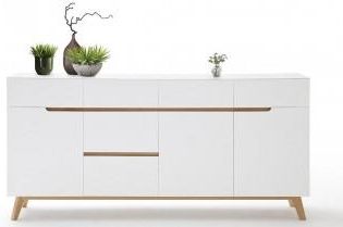 MC FURNITURE Komoda kolekcji CERVO Nowoczesna komoda CERVO inspirowana latami 60' wpisuje się doskonale także w styl retro. Wykonana została z MDF lakierowanego matowego z elementami naturalnego drewna i forniru dębowego Posiada sześć szuflad i troje drzwi z cichym domykiem. Mebel dostępny jest w paczkach do samodzielnego montażu , każdy mebel zawiera instrukcję montażu. WYMIARY: - długość: 193 cm - szerokość: 41 cm - wysokość: 95 cm MATERIAŁY: - podstawa:drewno dąb - korpus i fronty: lakier biały mat