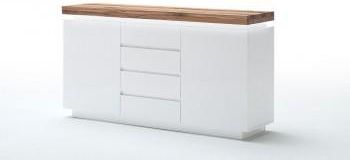MC FURNITURE Komoda kolekcji ROMINIA 93 Komoda kolekcji ROMINA to połączenie białego matowego lakieru z blatem z naturalnego drewna dębowego głęboko olejowanego. Na blacie są liczne pęknięcia i sęki charakterystyczne dla naturalnego drewna.Komoda posiada w komplecie oświetlenie Led sterowane …