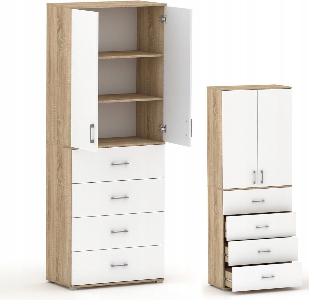 Regał Szafa biurowa z szufladami 215 RELIC 4S2D dąb sonoma / biały 40 cm Regał z serii RELIC przyda się w nowoczesnym, jak i klasycznym wnętrzu biura, salonu, sypialni czy pokoju młodzieżowego. Rozwiązanie to dedykowano osobom, które cenią sobie prostotę i elegancję. Bryła charakteryzuje się prostą minimalistyczną formą, która została wykonana z trwałych materiałów zapewniających jej bezpieczeństwo oraz wygodę użytkowania przez długie lata. Ergonomiczne wymiary regału zapewniają swobodę w umeblowaniu dowolnego pomieszczenia. ✅ Cechy charakterystyczne: nowoczesne wzornictwo podwyższona odporność na uszkodzenia funkcjonalne szuflady modna kolorystyka możliwość montażu regału bez nóżek Mebel pakowany w częściach do samodzielnego montażu wraz z czytelną instrukcją i akcesoriami montażowymi. ✅ Wymiary regału: Szerokość: 40 cm Głębokość: 40 cm Wysokość: 215 cm ✅ Wnętrze: Regał posiada trzy półki zamykane dwoma drzwiczkami, które pomogą posegregować poskładaną odzież, kolekcję książek lub inne drobiazgi. Dolną część zajmują cztery szuflady, w których można z łatwością ułożyć teczki na dokumenty, płyty z muzyką czy inne niezbędne przedmioty. Szuflady zostały zamontowane na solidnych prowadnicach kulkowych z pełnym wysuwem, które znacząco podnoszą komfort korzystania z mebla. ✅ Wymiary szuflady: Szerokość: 31 cm Głębokość: 33 cm Wysokość frontu: 25,5 cm Wysokość boczku: 16 cm Maksymalna wysokość przedmiotu, który zmieści się w szufladzie: 21 cm ✅ Wykończenie: Korpus w kolorze dąb sonoma oraz fronty wybarwione na biały mat skonstruowano z wysokiej jakości płyty laminowanej producenta Kronopolo grubości 16 mm. Dodatkowym zabezpieczeniem jest obrzeże PCV chroniące krawędzie płyty przed zarysowaniem i wilgocią. Prostokątne stopki z tworzywa sztucznego dają odpowiednie podparcie dla całej bryły.