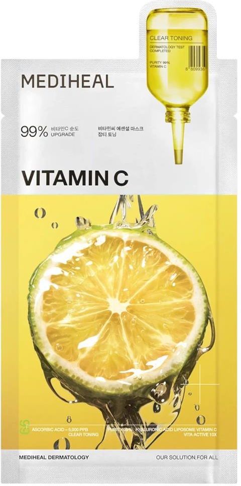 Mediheal Vitamin C Essential Mask Clear Toning Mediheal Vitamin C Essential Mask Clear Toning to zaawansowana maska do twarzy w płachcie, opracowana w celu intensywnego rozjaśnienia i nawilżenia skóry. Formuła maski została nasycona bogatą esencją zawierającą starannie wyselekcjonowane składniki aktywne, które wspierają zdrowy i promienny wygląd cery. Właściwości i korzyści Przyczynia się do rozjaśnienia nierównomiernego kolorytu skóry, nadając jej promienny wygląd Intensywnie nawilża, wspomagając utrzymanie odpowiedniego poziomu hydratacji Wspiera jędrność i elastyczność skóry poprzez optymalne nawilżenie Pozostawia skórę odświeżoną i wygładzoną Składniki aktywne i ich działanie Witamina C (Ascorbic Acid): znana ze swoich właściwości antyoksydacyjnych, wspomaga rozjaśnianie skóry i redukcję przebarwień, przyczyniając się do wyrównania jej kolorytu Niacynamid (Niacinamide): witamina B3, która wspomaga wzmocnienie bariery ochronnej skóry, redukuje zaczerwienienia oraz przyczynia się do poprawy ogólnego wyglądu cery Wyciąg z rokitnika zwyczajnego (Hippophae Rhamnoides Fruit Extract): bogaty w witaminy i antyoksydanty, wspomaga regenerację skóry i dodaje jej blasku Pantenol (Panthenol): prowitamina B5, znana ze swoich właściwości łagodzących i nawilżających, wspomaga utrzymanie miękkości i elastyczności skóry Sposób użycia Oczyść dokładnie skórę twarzy Wyjmij maskę z opakowania i delikatnie rozłóż Nałóż maskę na twarz, zaczynając od czoła, następnie dopasowując do policzków i brody Naciągnij maskę w kierunku uszu, aby zapewnić dokładne przyleganie Pozostałą w opakowaniu esencję wmasuj w skórę szyi i dekoltu Po upływie 10-20 minut delikatnie zdejmij maskę Pozostałą na skórze esencję wklep delikatnie opuszkami palców do całkowitego wchłonięcia Efekty Skóra staje się bardziej promienna i pełna blasku Odczuwalne jest intensywne nawilżenie skóry Koloryt skóry wydaje się bardziej jednolity Skóra jest odświeżona i wygładzona Intensywnie rozjaśnia i nawilża skórę! Mediheal Vitamin C Essential Mask Clear Toning to efektywna maska w płachcie, która dzięki zawartości witaminy C, niacynamidu, wyciągu z rokitnika zwyczajnego oraz pantenolu, intensywnie rozjaśnia i nawilża skórę. Regularne stosowanie maski wspomaga poprawę kolorytu cery, zwiększa jej elastyczność oraz pozostawia ją odświeżoną i promienną.
