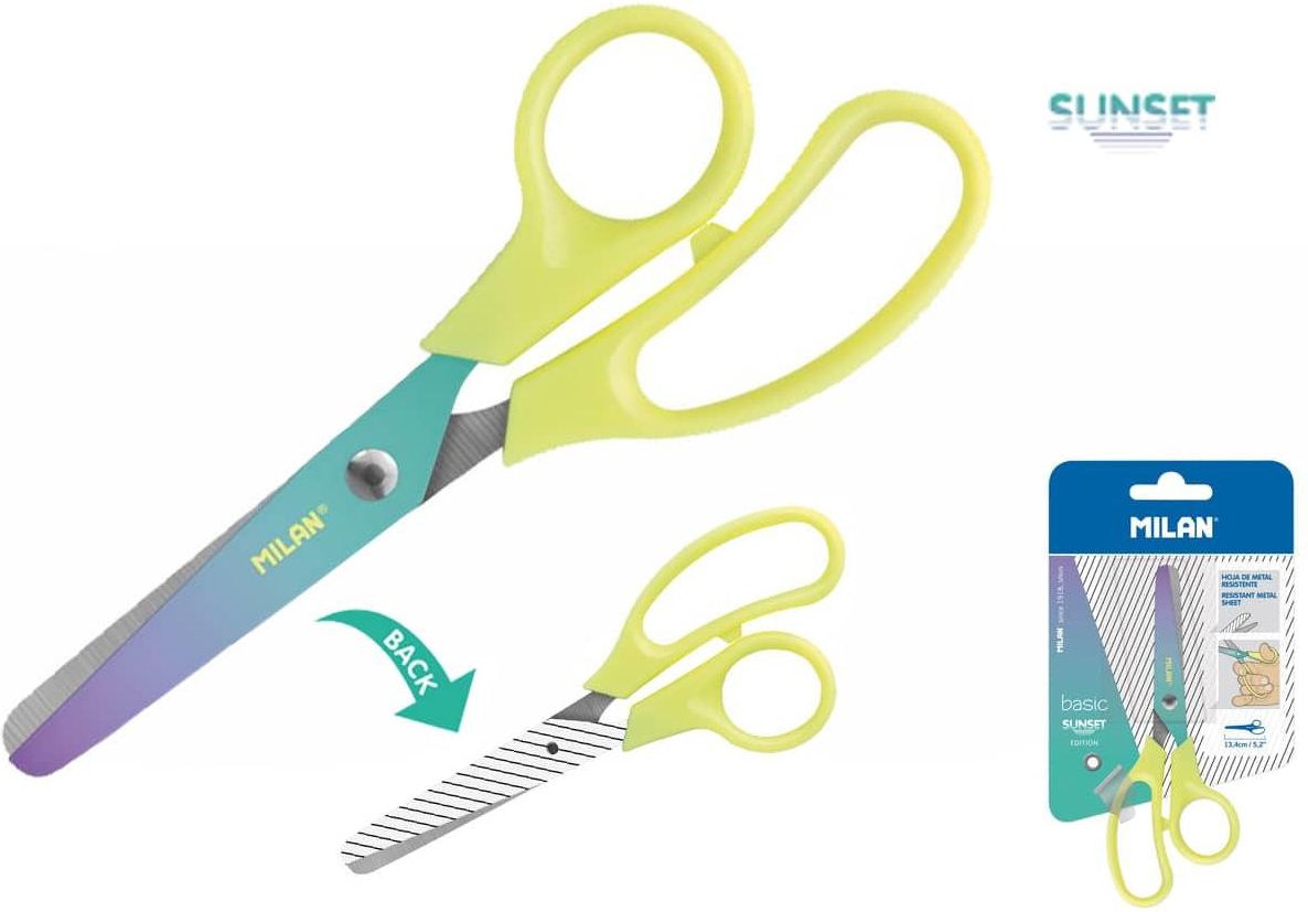 Nożyczki szkolne BASIC SUNSET z kolorowym ostrzem i plastikową żółtą rączką. Długość 13,3 cm. Ostrze ze stali nierdzewnej z zaokrągloną końcówką. Idealne do użytku szkolnego. Oryginalny produkt stworzony przez własny dział badawczo-rozwojowy MILAN. Rozmiar nożyczek: 13,3 x 5,3 x 1,1 cm.