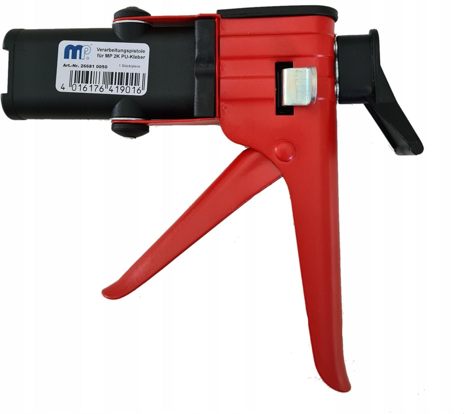 Pistolet ręczny do kleju dwuskładnikowego MP Zaprojektowany do użytku z produktami dwuskładnikowymi. Zapewnia maksymalną oszczędność czasu, znacznie ułatwiając proces mieszania poszczególnych składników produktów. Zastosowanie pistoletu w połączeniu z dyszami gwarantuje równomierną, dokładną oraz ekonomiczną aplikację produktu na wybranym elemencie.