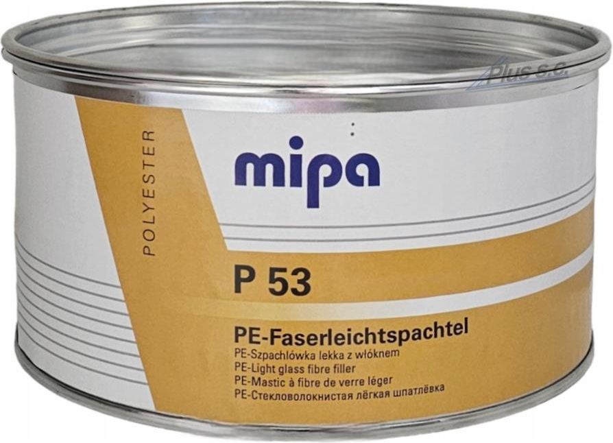 MIPA Szpachlówka poliestrowa lekka P53 ŻÓŁTA 1000ml OPAKOWANIE: 960ml szpachlówka + 40g utwardzacz Mipa P53 lekka, dwuskładnikowa szpachlówka z włóknem szklanymna bazie żywicy poliestrowej, łatwa w szlifowaniu. Posiada przyczepność do żelaza, stali, ocynku, aluminium, TWS i drewna. Ma bardzo niski ciężar właściwy ok. 1,05 – 1,1 g / ml. Ze względu na zawartość włókna szklanego produkt ten nadaje się szczególnie do wypełniania rys, małych otworów i uszkodzeń spowodowanych korozją, stosowana do renowacji samochodów, pojazdów i maszyn. Mipa P53 jest również idealna w modelarstwie i sektorach, w których konieczne jest zmniejszenie wagi. Wysoka odporność na wodę umożliwia stosowanie produktu w budowie łodzi.