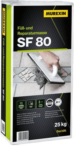 Murexin SF 80 Masa Szybkoschąca Naprawcza Podłogi Ściany Sufity Schody 25kg Proszkowa, uszlachetniona dodatkiem żywic syntetycznych szybkowiążąca i szybkoschnąca, wiążąca hydraulicznie masa szpachlowa o dużej wytrzymałości i twardości oraz niskim poziomie naprężeń. Przeznaczona do wyrównywania oraz naprawy powierzchni podłóg i ścian, do wyrównywania schodów i podestów oraz do wypełniania głębokich ubytków i nierówności w podłożach betonowych. Do stosowania w warstwie o grubości od 1 mm do 50 mm. Odporna na obciążenie kółkami krzeseł. Nadaje się na wodne ogrzewanie podłogowe. Do stosowania wewnątrz budynków. szybkoschnąca i szybkowiążąca gładka i twarda stabilna i wytrzymała bezskurczowa łatwa w formowaniu Zużycie: 1,5 kg/m²/mm grubości warstwy