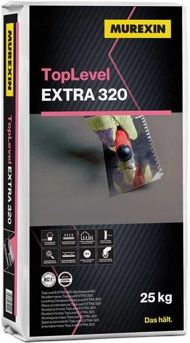 Murexin TopLevel EXTRA 320 Masa Samopoziomująca Zewnętrzna Wyrównawcza 25kg Dyspersja proszkowa, cementowo-żywiczna, wzmocniona włóknami, wiążąca hydraulicznie, samopoziomująca. Nadaje się do wylewania mechanicznego. Jest stosowana do wygładzania powierzchni zewnętrznych i wewnętrznych przed klejeniem różnych powłok dla grubości warstwy 3-20 mm.Jest zalecana do wyrównania i wykonywania spadków (maks. 3% na podłożach pochyłych). Obciążenie ruchem pieszym: po 3 godzinach, możliwość pokrycia: po ok. 24-48 godzinach. Szczególnie zalecana na zewnątrz do wyrównywania balkonów i tarasów. Nadaje się na ogrzewanie podłogowe i jest odporna na obciążenie kółkami krzeseł. Zgodna z EN13813 CT C25-F6, odporność na ogień: A1. samopoziomująca, stabilna, wzmocniona włóknami, w warstwie o grubości 3-20 mm, do użytku wewnętrznego i zewnętrznego, możliwość uzyskania spadku do 3% certyfikat EC1 PLUS Grubość warstwy: 3 - 20 mm Zużycie : ok. 1,6 kg / m2 na mm grubości warstwy