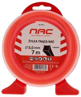 Żyłka marki Nac do kosy i podkaszarki w kształcie kwadratu o długości: 7 m i średnicy: 3 m, która się zużyła. Doskonałym wyborem będzie żyłka, charakteryzująca się doskonałą wytrzymałością, a co za tym idzie, jest bardziej wydajna.