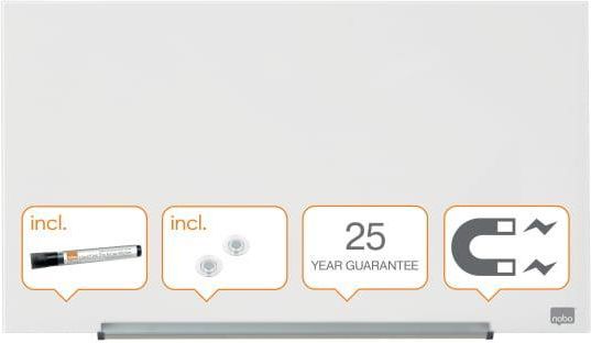 Szklana magnetyczna tablica suchościeralna prezentuje się niezwykle elegancko i stylowo. System InvisaMount™ sprawia, że instalacja jest łatwa, a mocowania są starannie ukryte z tyłu tablicy. Szklana magnetyczna powierzchnia tablicy odznacza się ultrawysokim poziomem ścieralności i najwyższą odpornością na plamy z tuszu, ślady po mazakach, zadrapania i wgniecenia. Tablica wyposażona jest w zdejmowaną półkę na markery. Rozmiar: 680 x 380 mm. Szklana magnetyczna powierzchnia tablicy suchościeralnej odznacza się ultrawysokim poziomem ścieralności i najwyższą odpornością na plamy z tuszu, ślady po mazakach, zadrapania i wgniecenia Rozmiar: 680 x 380 mm Eleganckie i stylowe bezramowe wzornictwo oraz zdejmowana półka na suchościeralne markery do tablic System InvisaMount™ sprawia, że instalacja jest łatwa, a mocowania są starannie ukryte z tyłu tablicy 25-letnia gwarancja na powierzchnię tablicy W komplecie marker Nobo oraz zestaw ekstramocnych magnesów Nobo do szklanych tablic Firma Nobo zaleca comiesięczne czyszczenie ceramicznych tablic suchościeralnych w celu zachowania ich właściwości użytkowych 25-letnia gwarancja
