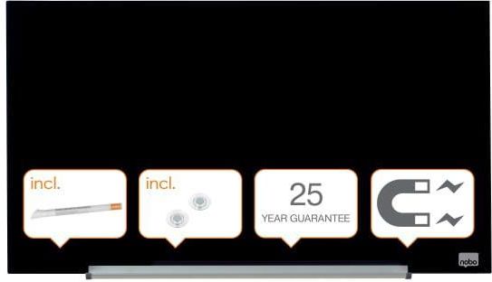 Szklana magnetyczna tablica suchościeralna prezentuje się niezwykle elegancko i stylowo. System InvisaMount™ sprawia, że instalacja jest łatwa, a mocowania są starannie ukryte z tyłu tablicy. Szklana magnetyczna powierzchnia tablicy odznacza się ultrawysokim poziomem ścieralności i najwyższą odpornością na plamy z tuszu, ślady po mazakach, zadrapania i wgniecenia. Tablica wyposażona jest w zdejmowaną półkę na markery. Rozmiar: 680 x 380 mm. Szklana magnetyczna powierzchnia tablicy suchościeralnej odznacza się ultrawysokim poziomem ścieralności i najwyższą odpornością na plamy z tuszu, ślady po mazakach, zadrapania i wgniecenia Rozmiar: 680 x 380 mm Eleganckie i stylowe bezramowe wzornictwo oraz zdejmowana półka na suchościeralne markery do tablic System InvisaMount™ sprawia, że instalacja jest łatwa, a mocowania są starannie ukryte z tyłu tablicy 25-letnia gwarancja na powierzchnię tablicy W komplecie marker Nobo oraz zestaw ekstramocnych magnesów Nobo do szklanych tablic Firma Nobo zaleca comiesięczne czyszczenie ceramicznych tablic suchościeralnych w celu zachowania ich właściwości użytkowych 25-letnia gwarancja