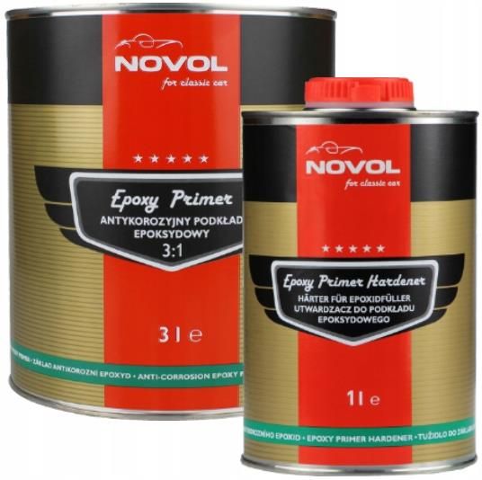NFCC Novol For Classic Car Epoxy Primer / Podkład epoksydowy 3L + Utwardzacz 1L proporcja mieszania 3:1 EPOXY PRIMER to najnowszej generacji podkład epoksydowy klasy VHS, który zaopatrzony dodatkowo w inhibitory korozji łączy w sobie dwa typy zabezpieczenia antykorozyjnego. Jednocześnie daje ochronę antykorozyjną barierową jak i protektorową. Specjalnie wyselekcjonowana kompozycja żywic epoksydowych i wypełniaczy mineralnych zmielonych w młynie perełkowym, daje bardzo gładką powierzchnię, o kremowo beżowym kolorze z lekkim połyskiem, w celu lepszej identyfikacji miejsc wymagających formowania. Podwójna protekcja produktu daje nam gwarancję właściwego zabezpieczenia powierzchni silnie porowatych np: po piaskowaniu lub innym oczyszczeniu mechanicznym, gdzie struktura powierzchni powoduje różne grubości warstwy i samo zabezpieczenie barierowe może być niewystarczające. W komplecie z utwardzaczem EPOXY PRIMER HARDENER. Poprawna proporcja zmieszania podkładu z utwardzaczem wynosi 3 : 1. Pojemności opakowań obu produktów zostały dobrane optymalnie do wymaganych proporcji. pojemność opakowania: 3L + 1L