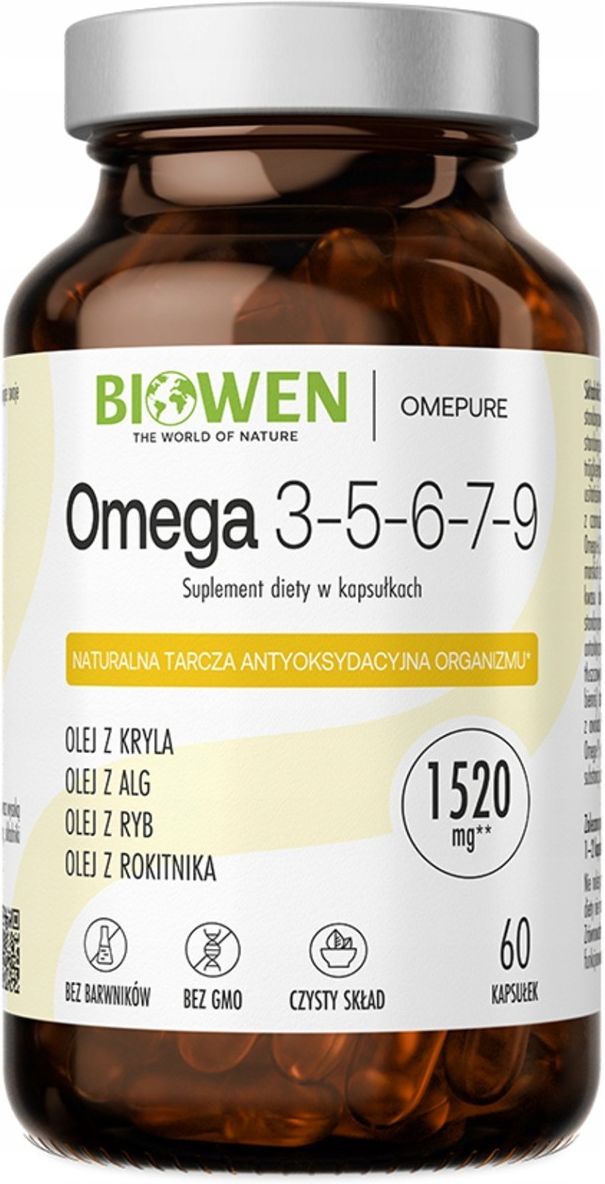 Biowen Omega 3-5-6-7-9 Suplement zawiera 5 rodzajów kwasów omega (3-5-6-7-9) w optymalnych proporcjach - dla zdrowej skóry, wzroku, mózgu i odporności obfituje w cenne dla organizmu przeciwutleniacze; oparty na naturalnych, dobrze wchłanialnych formach omega; dla osób dbających o jasność myślenia i młody wygląd; przyjazny środowisku - czysty skład, naturalne kapsułki z żelatyny wołowej, szklane opakowanie z metalową nakrętką; Witamina E - wspiera komórki przed uszkodzeniem oksydacyjnym, Rokitnik - wspiera zdrową skórę od wewnątrz, Wiesiołek - wspiera nawilżenie, elastyczność skóry, opakowanie zawiera 60 kapsułek. BEZ barwników, bez GMO, czysty skład. Omega 3-5-6-7-9 Biowen 60 kapsułek Omega 3-5-6-7-9 Biowen to kompleksowy suplement diety przeznaczony dla osób, które chcą świadomie uzupełniać codzienną dietę w różnorodne kwasy tłuszczowe omega i wspierać organizm w dłuższej perspektywie. Sprawdzi się u kobiet i mężczyzn w różnym wieku, a szczególnie u osób po 30. roku życia, prowadzących aktywny tryb życia lub funkcjonujących w warunkach zwiększonego obciążenia fizycznego i psychicznego. Formuła łączy kwasy omega pochodzenia morskiego i roślinnego, tworząc zaawansowany kompleks lipidowo-antyoksydacyjny. Zawiera m.in. olej rybi dostarczający EPA i DHA, DHA z mikroalg Schizochytrium sp., olej z kryla antarktycznego będący źródłem fosfolipidów oraz oleje roślinne z rokitnika, czarnuszki, wiesiołka i awokado. Suplement polecany jest osobom, którym zależy na utrzymaniu prawidłowej pracy serca, a także na wsparciu organizmu w okresach intensywnej aktywności, zmian hormonalnych czy naturalnych procesów starzenia. Produkt może stanowić wartościowy element zróżnicowanej diety i zdrowego stylu życia dla osób, które oczekują czegoś więcej niż standardowej suplementacji kwasami omega. Dlaczego warto wybrać Omega 3-5-6-7-9 od Biowen? Kwasy omega od Biowen zapewniają wielowymiarowe wsparcie organizmu, dbając o pracę serca; preparat zawiera pełne spektrum naturalnie występujących kwasów tłuszczowych z rodziny omega (aż 5 rodzajów!). Synergiczne działanie wszystkich składników przekłada się na kompletne wsparcie odżywcze organizmu i zaawansowaną ochronę komórek; to suplement nowej generacji o zaawansowanej technologii ekstrakcji, optymalnych proporcjach składników i czystej formule pozbawionej zbędnej chemii; zawiera cenne dla zdrowia kwasy EPA i DHA. Co to? EPA, czyli kwas eikozapentaenowy, oraz DHA, czyli kwas dokozaheksaenowy, to kluczowe dla zdrowia kwasy omega 3, których nasz organizm nie jest w stanie samodzielnie wytwarzać. Aby cieszyć się zdrowiem, należy codziennie dostarczać je wraz z pożywieniem lub zadbać o wartościową suplementację. Do czego są nam potrzebne? Spożywane w ilości ≥ 250 mg/dzień dbają o prawidłową pracę mózgu, opóźniają procesy starzenia wzroku i wspierają funkcjonowanie układu krwionośnego. Składniki Olej z rokitnika zwyczajnego (25% Omega-7), olej rybi z sardeli (30% Omega-3), ekstrakt z owocu granatu, olej lniany (45% Omega-3), olej z czarnuszki (Omega-6 i 9), olej z mikroalg morskich (40% DHA), oliwa z oliwek (55% Omega-9), olej z kryla antarktycznego (Omega-3 w formie fosfolipidów), olej z wiesiołka (9% GLA), olej z awokado, witamina E (D-alfa tokoferol), otoczka kapsułki: żelatyna wołowa, substancja utrzymująca wilgoć: glicerol. Składniki – 1 kapsułka: Składniki – 2 kapsułki Olej z rokitnika zwyczajnego – 420 mg: Olej z rokitnika zwyczajnego – 840 mg – kwas palmitooleinowy – 105 mg: – kwas palmitooleinowy – 210 mg – kwas oleinowy – 42 mg: – kwas oleinowy – 84 mg Olej rybi TG – 333,3 mg: Olej rybi TG – 666,6 mg – EPA – 50 mg: – EPA – 100 mg – DHA – 40 mg: – DHA – 80 mg Ekstrakt z pełnego owocu granatu – 186 mg: Ekstrakt z pełnego owocu granatu – 372 mg – kwas punikowy – 130,2 mg: – kwas punikowy – 260,4 mg – kwas linolowy (LA) – 7,7 mg: – kwas linolowy (LA) – 15,4 mg – kwas oleinowy – 5,6 mg: – kwas oleinowy – 11,2 mg Olej lniany – 164 mg: Olej lniany – 328 mg – kwas linolowy (LA) – 16,4 mg: – kwas linolowy (LA) – 32,8 mg – kwas oleinowy – 15,6 mg: – kwas oleinowy – 31,2 mg Olej z czarnuszki – 135 mg: Olej z czarnuszki – 270 mg – kwas linolowy (LA) – 67,5 mg: – kwas linolowy (LA) – 135 mg – kwas oleinowy – 27 mg: – kwas oleinowy – 54 mg – tymochinon – 2,7 mg: – tymochinon – 5,4 mg Olej z mikroalg morskich – 120 mg: Olej z mikroalg morskich – 240 mg – DHA – 48 mg: – DHA – 96 mg Oliwa z oliwek – 58,5 mg: Oliwa z oliwek – 117 mg – kwas linolowy (LA) – 2 mg: – kwas linolowy (LA) – 4 mg – kwas oleinowy – 32,2 mg: – kwas oleinowy – 64,4 mg Olej z kryla – 50 mg: Olej z kryla – 100 mg – EPA – 5 mg: – EPA – 10 mg – DHA – 2,6 mg: – DHA – 5,2 mg Olej z wiesiołka – 28,5 mg: Olej z wiesiołka – 57 mg – kwas linolowy (LA) – 20 mg: – kwas linolowy (LA) – 40 mg – kwas gamma-linolenowy (GLA) – 2,6 mg: – kwas gamma-linolenowy (GLA) – 5,2 mg – kwas oleinowy – 1,1 mg: – kwas oleinowy – 2,2 mg Olej z awokado – 12 mg: Olej z awokado – 24 mg – kwas oleinowy – 5 mg: – kwas oleinowy – 10 mg – kwas linolowy (LA) – 0,9 mg: – kwas linolowy (LA) – 1,8 mg – kwas palmitooleinowy – 0,5 mg: – kwas palmitooleinowy – 1 mg D-alfa-tokoferol (witamina E) – 13 mg / 19 IU (108% RWS): D-alfa-tokoferol (witamina E) – 26 mg / 38 IU (216% RWS) *** RWS - dzienna referencyjna wartość spożycia witamin i składników mineralnych (dla osób dorosłych). Stosowanie: Zalecana porcja: 1-2 kapsułki dziennie podczas posiłku. Nie należy przekraczać zalecanej porcji do spożycia w ciągu dnia. Nie stosować w przypadku uczulenia na którykolwiek ze składników. W przypadku stosowania innych suplementów lub leków, konieczna jest kons