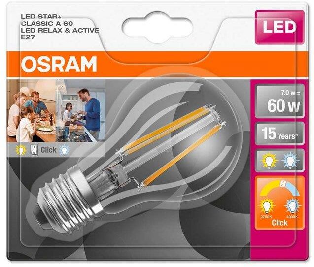 Osram LED RELAX and ACTIVE A 60 FIL 7 W/2700K E27 Lampa LED w kształcie tradycyjnej żarówki. Cechy produktu Możliwość wyboru temperatury barwowej światła 2700 K i 4000 K w tej samej lampie. Możliwość sterowania przy pomocy standardowego przełącznika ściennego. Dobra jakość światła, wskaźnik …