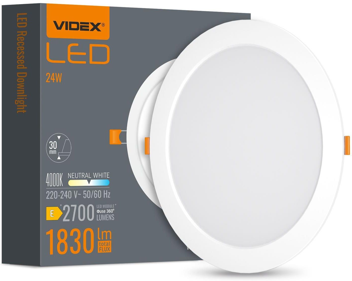 OPRAWA OŚWIETLENIOWA LED WPUSZCZANA 1830 LUMENÓW ŚWIATŁO 4000K VLE-DLBR-244 Oprawa wpuszczana LED VIDEX 24W 4000K to eleganckie i energooszczędne rozwiązanie do każdego wnętrza. Dzięki ultracienkiej konstrukcji o głębokości 30 mm doskonale komponuje się z sufitami podwieszanymi, nadając wnętrzu nowoczesny i minimalistyczny wygląd. Jej szeroki kąt rozpraszania oraz wysoka jakość wykonania gwarantują komfortowe oświetlenie przez długie lata. CECHY PRODUKTU Neutralna barwa światła 4000K – imituje naturalne światło dzienne, idealna do codziennego użytku. Współczynnik oddawania barw Ra > 80 – realistyczne, wyraźne kolory w każdym wnętrzu. Brak migotania oraz emisji UV i IR – komfortowe i bezpieczne dla oczu oświetlenie. Długa żywotność – do 30 000 godzin pracy – ponad 10 lat działania przy codziennym użytkowaniu. Odporność na 20 000 cykli włączania/wyłączania – niezawodność w intensywnie eksploatowanych pomieszczeniach. Klosz z poliwęglanu ze stabilizatorem UV – odporność na żółknięcie i długotrwałe zachowanie estetyki. Szeroki zakres napięcia pracy – stabilna praca nawet przy skokach napięcia. Technologia LED VIDEX – energooszczędność, trwałość i wysoka jakość wykonania. SPECYFIKACJA Moc: 24 W Strumień świetlny: 1830 lm Wskaźnik oddawania barw: Ra > 80 Temperatura barwowa światła: 4000K (światło dzienne) Napięcie: AC 220-240 V, 50/60 Hz Klasa energetyczna: E Kąt rozproszenia: 120° Żywotność: 30 000 godzin Cykle włącz/wyłącz: 20 000 Wymiary: 295 mm x 30 mm Średnica otworu wpuszczanego: 281-286 mm Stopień ochrony: IP20 Temperatura pracy: -20°C ~ +40°C Materiał obudowy: Plastik Masa netto: 230 g