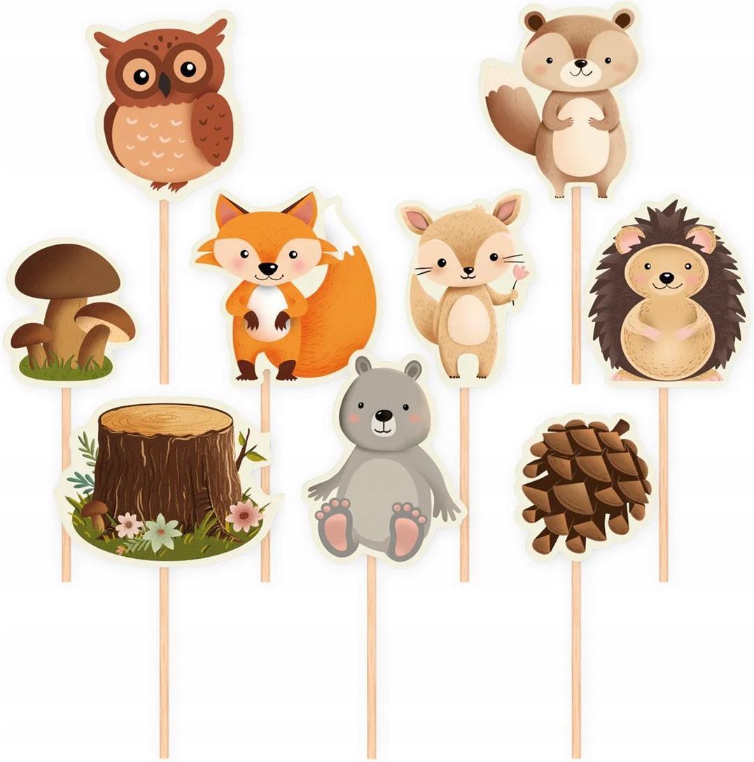 Toppery na tort zwierzątka leśne. Wysokość: ok. 10-11,5 cm. Opakowanie zawiera 9 sztuk pojedynczych pikerów.