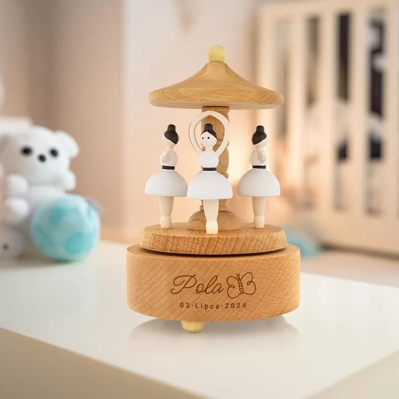 Ta urocza pozytywka to nie tylko piękna ozdoba pokoju, ale także magiczny akompaniament do każdego tańca. Po nakręceniu, baletnice zaczynają tańczyć delikatnie do melodii “Castle in the Sky”, wprowadzając dziecko w świat magii baletu. To idealny prezent dla każdej małej pasjonatki tańca i marzycielki! Parametry pozytywka karuzela z baletnicami materiał: lite drewno bukowe średnica: 11 cm wysokość: 17 cm mechanizm napędzany sprężyną nakręcana ręcznie, nie posiada wyłącznika wygrywa melodię japońską “Castle in the Sky” laserowy grawer dedykacji na podstawie pozytywki oryginalnie zapakowana przez producenta w pudełko tekturowe Uwaga! Pozytywka nie służy do zabawy, stanowi jedynie element dekoracyjny. Personalizacja Aby w pełni spersonalizować swój prezent, skorzystaj z naszego edytora. Wprowadź odpowiednie dane, a nasi graficy zajmą się resztą.