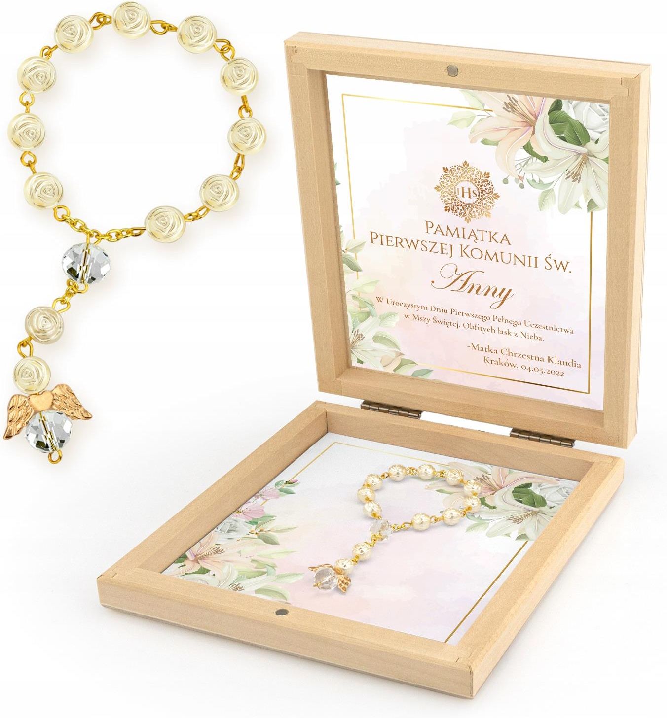 Dziesiątek różańca na komunię Wykonany z masy perełkowej dziesiątek różańca to doskonały upominek dla dziecka przyjmującego I Komunię Świętą. Ozdobne skrzydła anioła tak jak pozostałe koraliki połączone są metalowym splotem. Różaniec zapakowany będzie w drewnianą szkatułkę z nadrukiem dedykacji. To piękna pamiątka tego ważnego dnia. Parametry Różaniec wykonany z masy perełkowej paciorki w kształcie różyczek metalowe łączenia koralików ozdobne skrzydła anioła przy początkowym paciorku kryształki: 6 mm długość różańca: 13 cm dziesiątek zapakowana jest w woreczek z organzy Pudełko wymiary szkatułki: ok. 17 x 15 x 2,5 cm wykonana z naturalnego drewna w środku szkatułki umieszczony jest piękny nadruk szkatułka zamykana na magnes polski producent wysoka jakość wykonania Dane do personalizacji podaj w wiadomości do sprzedającego.