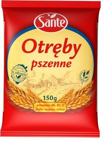 Otręby pszenne Otręby pszenne mogą być częścią dobrze zbilansowanej diety ze względu na:- wysoką zawartość błonnika pokarmowego- zawartość witamin: wit. B6, niacyny, tiaminy, wit. E, kwasu foliowego- zawartość składników mineralnych: fosforu, magnezu, żelaza, cynku, potasu, jodu, manganuZawarty w otrębach pszennych Sante magnez przyczynia się do zmniejszenia uczucia zmęczenia i znużenia, do utrzymania prawidłowego metabolizmu energetycznego oraz pomaga w utrzymaniu zdrowych kości i zębów*.*Już jedna porcja (20 g) otrąb pszennych Sante spożywana regularnie w ramach zbilansowanej diety i aktywnego trybu życia, pozwoli uzyskać powyższy efekt zdrowotny.Żywność funkcjonalna To żywność zawierająca substancje bioaktywne, takie jak błonnik, pro- i prebiotyki, witaminy, substancje mineralne i inne. Dzięki nim żywność funkcjonalna wykazuje korzystny wpływ na jedną lub więcej funkcji naszego organizmu. Na zdrowie! żywność funkcjonalna, wysoka zawartość błonnika, witamina: B6, B1, E, fosfor, magnez, żelazo Przechowywać w ciemnym, suchym i chłodnym miejscu.