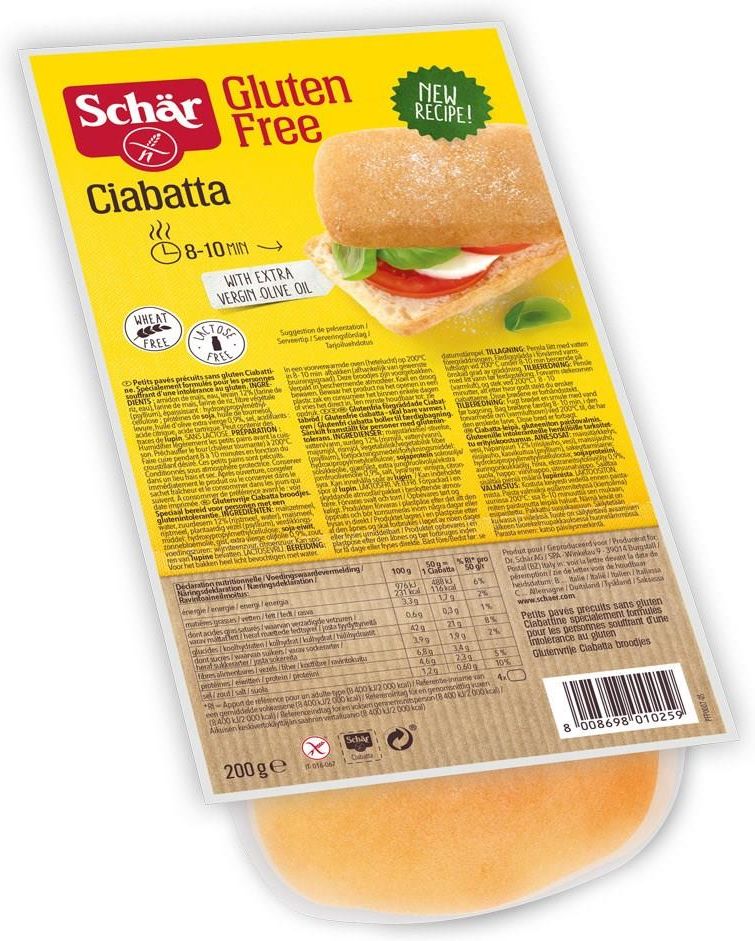 Opis produktu Dieta bezglutenowa polega na bezwzględnej eliminacji z pożywienia produktów zawierających w składzie gluten. Gluten z natury występuje w: pszenicy, życie, jęczmieniu, owsie, orkiszu i pszenżycie. Dopuszczalna ilość glutenu w produkcie poniżej 20 ppm = 0,02%, co muszą potwierdzić badania w akredytowanym laboratorium. Firma Schar jest numerem 1 w Europie w produkcji bezglutenowej mąki, chleba, makaronów, przekąsek, ciastek i słodyczy. Ciabata to bezglutenowy produkt. Smaczna ciabata w 100% odzwierciedla smak tradycyjnego pieczywa. Wartość odżywcza w 100 g produltu Wartość energetyczna (kj/kcal) 1019/241 Tłuszcz 3 w tym kwasy tłuszczowe nasycone 0.5 Węglowodany 46 w tym cukry 2.7 Białko 3.9 Sól 1.1 Błonnik 7.4 Skład Skrobia kukurydziana, woda, mąka kukurydziana, włókno roślinne (psyllium), mąka ryżowa, dekstroza, substancja zagęszczająca: hydroksypropylometyloceluloza ; białko sojowe, olej słonecznikowy, drożdże, sól, środek zakwaszający: kwas winowy, kwas cytrynowy . Produkt nie zawiera substancji słodzących Warunki przechowywania Przechowywać w suchym i chłodnym miejscu. Gwarantowany termin przydatności: 83 dni Informacje alergenne Alergeny obecne w zakładzie: sezam, laktoza, łubin, soja, dwutlenek siarki, jaja, orzechy arachidowe
