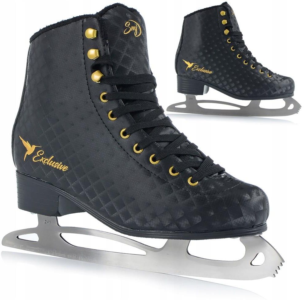 ŁYŻWY FIGUROWE DAMSKIE SMJ EXCLUSVE OCIEPLANE Rozmiar: 36 długość wkładki: 23,5cm ✅Opis techniczny: Przeznaczenie: jazda figurowa Rodzaj zapięcia: sznurowane Materiał zewnętrzny: skóra syntetyczna Materiał wewnętrzny: futerko, oraz mesh Podeszwa: tworzywo sztuczne Płoza: stal nierdzewna ✅Tabela rozmiarów: 35: 23cm 36: 23,5cm 37: 24cm 38: 24,5cm 39: 25cm 40: 25,5cm 41: 26cm 42: 26,5cm ✅Klasyczne, piękne łyżwy figurowe! Łyżwy figurowe damskie, sznurowane, model: Exclusive. Klasyczne, kolor czarny, ozdobione delikatnym, złotym nadrukiem. Wykonane ze skóry syntetycznej. Właściwie wyprofilowany but, usztywnia nogę, zapewniając przy tym odpowiednią elastyczność. ✅Solidna płoza ze stali hartowanej! Płoza wykonana z hartowanej stali nierdzewnej, dzięki hartowaniu płoza jest twardsza, bardziej wytrzymała na częste ostrzenie i eksploatację. Wnętrze buta wykonane z materiału Velvet, dodatkowo ocieplone. Całość zapakowana w ładne, kolorowe pudełko sprawia iż nasze łyżwy znakomicie nadają się jako prezent na różne okazje.
