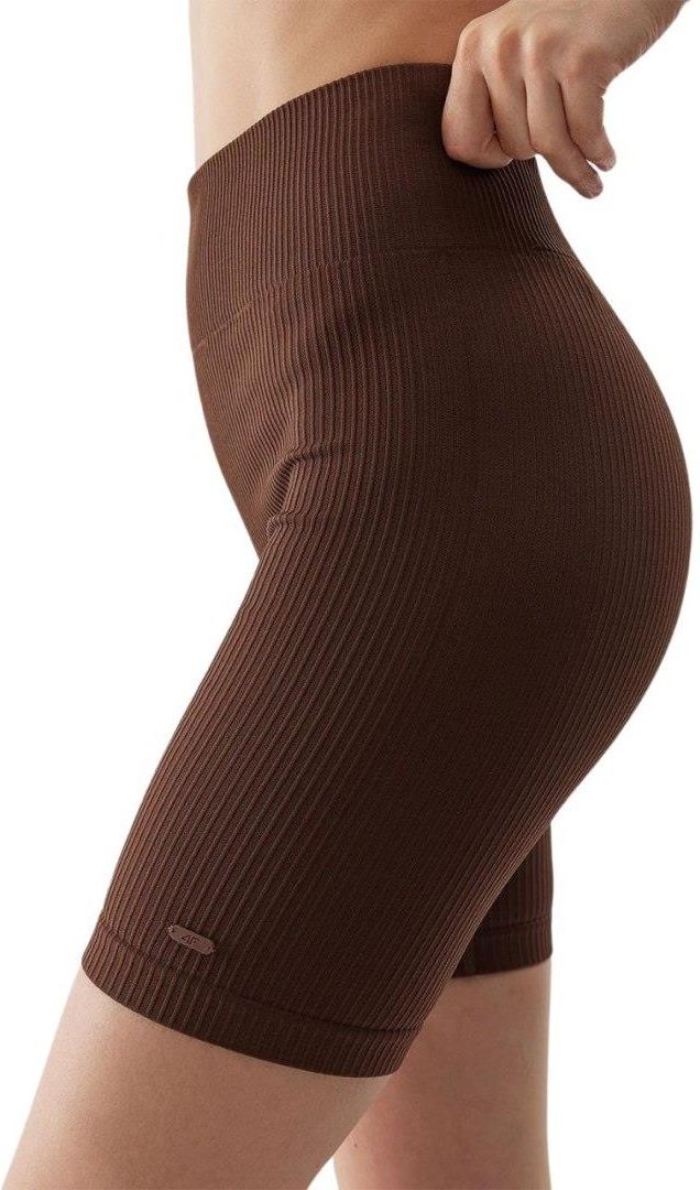 Spodenki damskie 4F F498 brązowe 4FWSS24TFSHF498 81S Krótkie legginsy damskie 4F pochodzące z kolekcji Delights of Meditation sprawdzą się podczas praktykowania jogi na różnych stopniach zaawansowania. Dopasowany krój slim przylega do ciała. Szybkoschnąca dzianina z charakterystyczne, pionowymi prążkami. Wysoki stan stabilizuje legginsy na sylwetce. Szybkoschnąca tkanina. System 4FDry odpowiada za aktywne odprowadzenie nadmiaru wilgoci do zewnętrznych warstw. Płaskie szwy zapobiegają otarciom podnosząc komfort noszenia. Spodenki wykonane z dodatkiem materiałów z recyklingu (zawiera 73% poliamidu z recyklingu). Materiał główny: 91% poliamid, 9% elastan