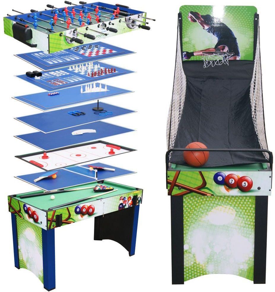 Stół do gier WORKER Supertable II to idealny wielofunkcyjny stół do gier do spędzania wolnego czasu. Dla młodych i starszych graczy oferuje 13 świetnych gier, które zapewnią im rozrywkę na wiele godzin. Jeśli znudzi Ci się któraś z gier, po prostu zmień planszę, w jednej chwili znajdziesz się w zupełnie innej grze, a zabawa może być kontynuowana. Doskonałym dodatkiem do gry jest także łatwy w montażu kosz do koszykówki, do którego można następnie rzucać i angażować całe ciało podczas gry. Lista gier i akcesoriów Piłkarzyki (2 x 11 graczy, 2 piłki) Koszykówka (akcesoria do koszykówki w tym mała piłka) Unihokej (2 napastników, 2 krążki) Ping-pong (siatka, 2 rakietki, 2 piłki) Mini bilard (zestaw bil bilardowych, 2 kije, trójkąt, 2 kredy) Karty, kostki (zestaw kart, kości) Mini kręgle (zestaw do gry w kręgle) Szachy (zestaw szachowy) Dama (zestaw do dam) Warcaby (zestaw do Warcabów) Shuffle board - rzucanie kamieniami (zestaw shuffle board) Podkowa - rzucanie podkowami (zestaw) Ringo - rzucanie pierścieniami w cel (zestaw ringo) Opis techniczny Wymiary stołu: długość 113 x szerokość 62 x wysokość 81 cm Wymiary planszy do piłkarzyków: 105 x 51 cm Wymiary tablicy do unihokeja: 84 x 47 cm Wymiary stołu bilardowego: 105 x 51 cm Wymiary stołu do tenisa stołowego: 105 x 51 cm Wymiary pozostałych plansz do gry: 80 x 43 cm Akcesoria: zestaw bil, 2 kije, trójkąt, 2 kredy, 2 krążki, 2 piłki nożne Wymiary opakowania: 125,8 x 64,8 x 23 cm Wysokość stołu: 87 cm Waga: 38,5 kg Wymiary Szerokość: 119 cm Wysokość: 66 cm Długość: 16 cm
