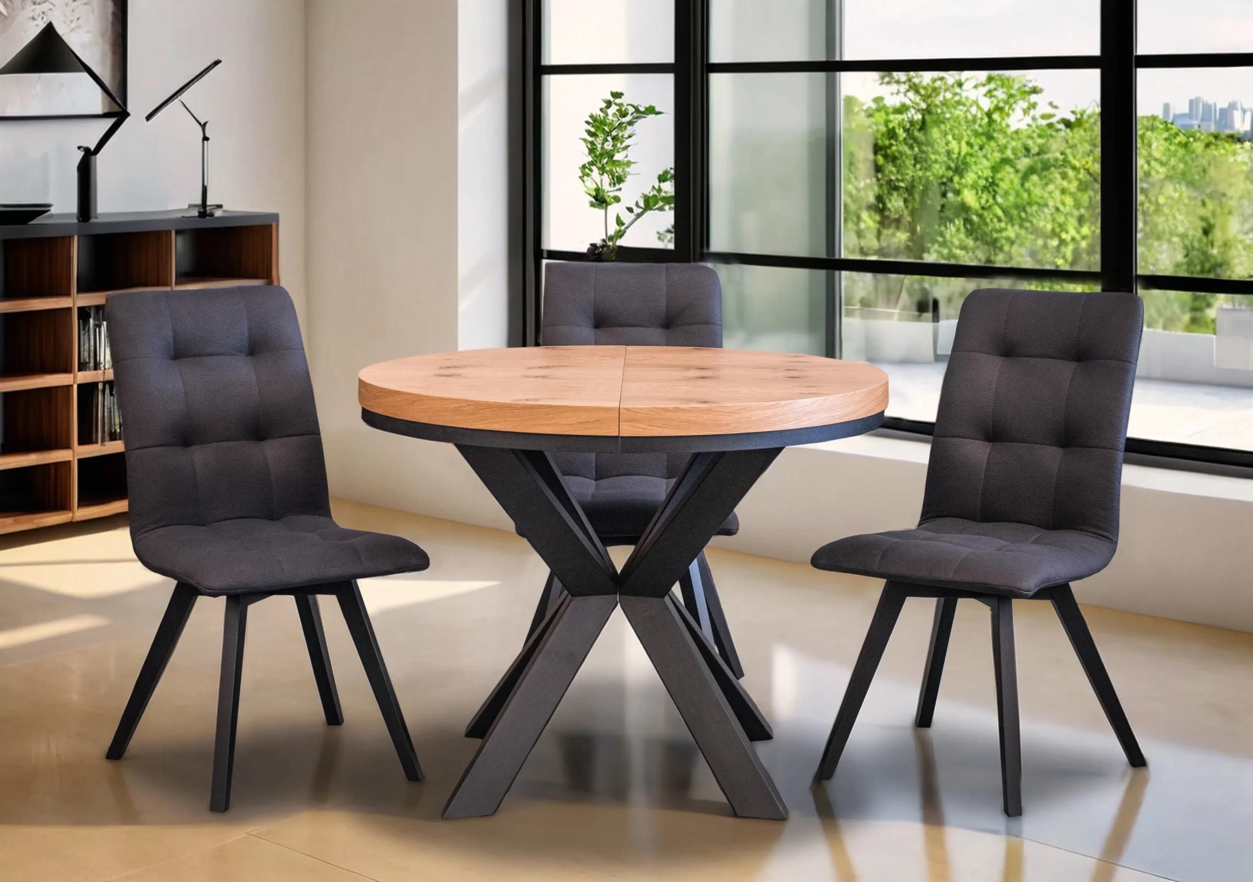 Stół loft x fi 100 + 2x50 + 4 krzesła KW110Zdjęcie przedstawia rzeczywisty wygląd zestawu. Nie jest wizualizacją komputerową. Stół LOFT – Elegancja drewna i metalu Stół LOFT o średnicy 100 cm to wyjątkowa propozycja dla wymagających klientów, którzy pragną wyróżnić swoje wnętrze mocnym akcentem w …