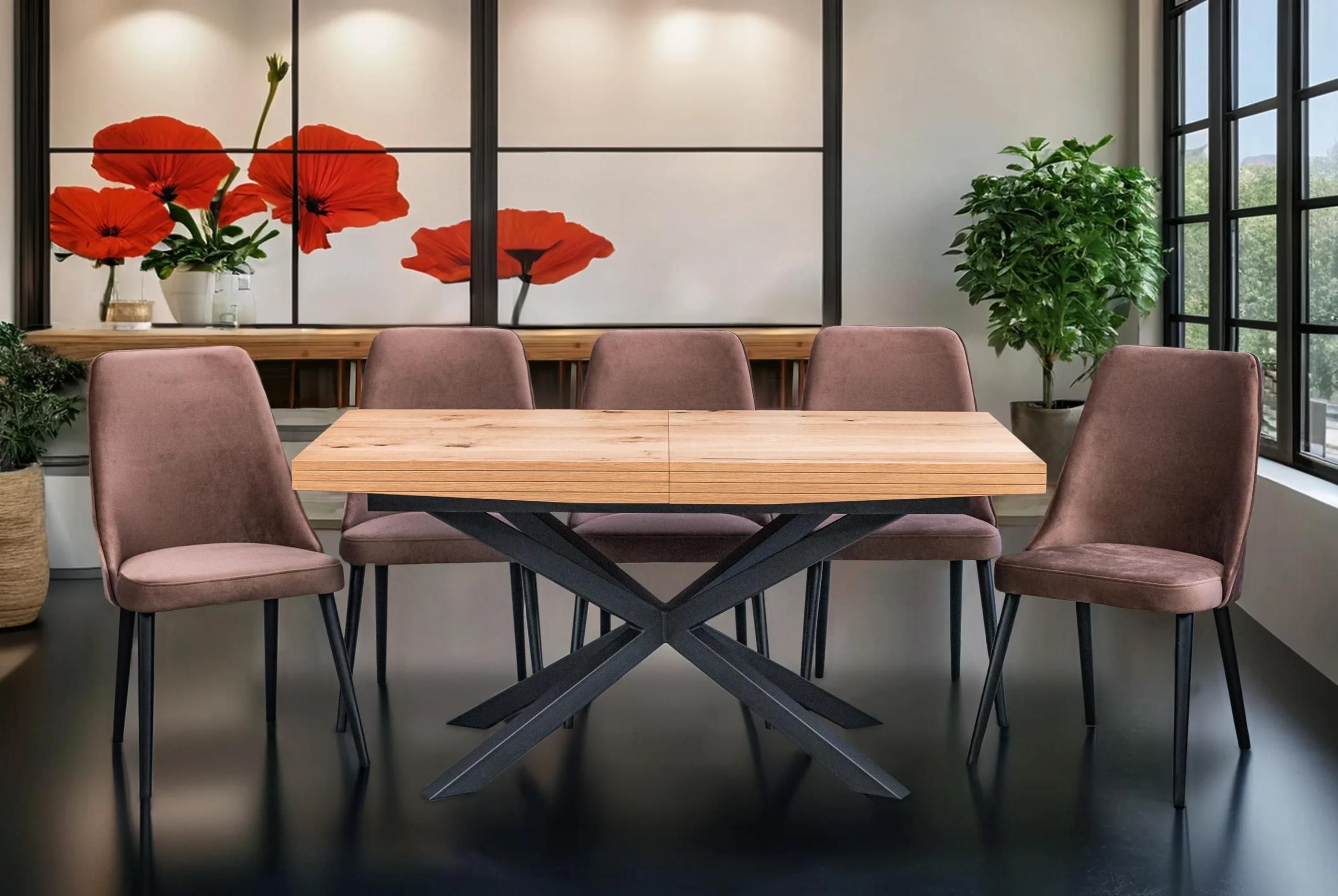 Stół SJ50 rozkładany 160x90 + 2x40 +6 krzeseł OloZdjęcie przedstawia rzeczywisty wygląd stołu. Nie jest wizualizacją komputerową. Najlepsze wydanie w stylu LOFT Stół SJ50 to piękny drewniany stół z mocną podstawą z czarnego metalu w kształcie pająka. Blat stołu wykonany jest z sękatego forniru …