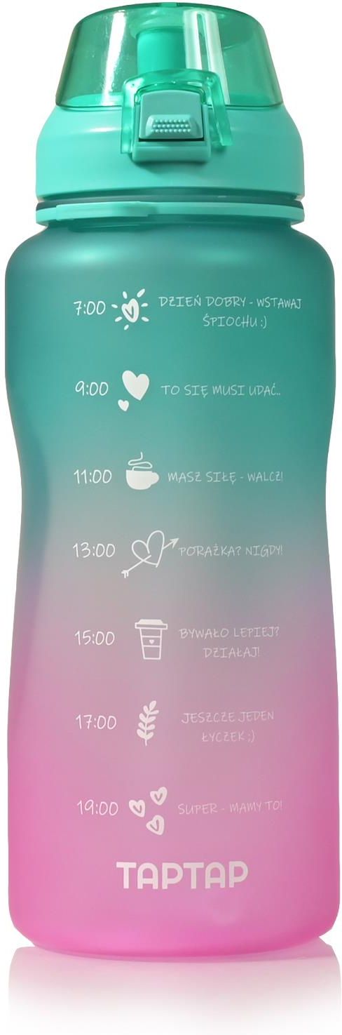 TAPTAP Bidon Butelka na Wodę 2L Bidon na wodę TAPTAP to idealny gadżet dla tych, którzy chcą regularnie się nawadniać. Motywująca miarka sprawi, że pamiętanie o nawodnieniu stanie się Twoim przyjemnym nawykiem. Bidon posiada wygodny ustnik ze słomką oraz automatyczne, szczelne zamknięcie. Bidon TAPTAP możesz zabrać ze sobą wszędzie - do pracy, szkoły, na siłownię czy wycieczkę. Pojemność: 2L