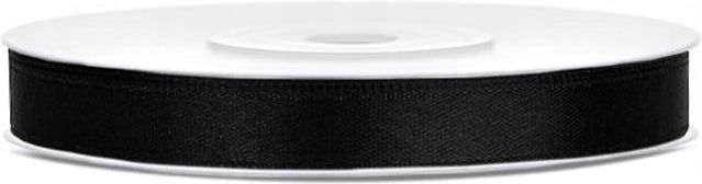 Tasiemka satynowa, czarny, 6mm/25m Tasiemka satynowa w kolorze czarnym, szerokość 6 milimetrów, długość 25 metrów. (1 szt. / 25 mb.)