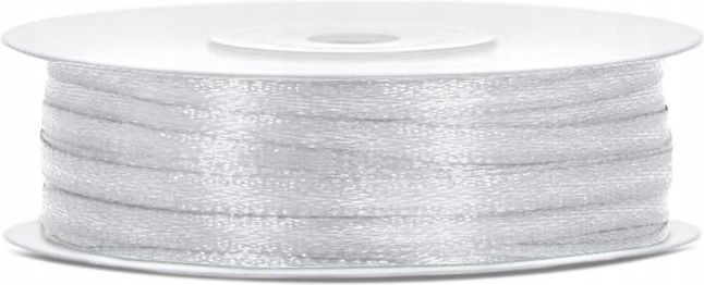 Tasiemka satynowa, kolor srebrny. Idealna do pakowania prezentów, dekoracji ślubnych itp. Wymiary: 3 mm / 50 m. Opakowanie: 1 szt.