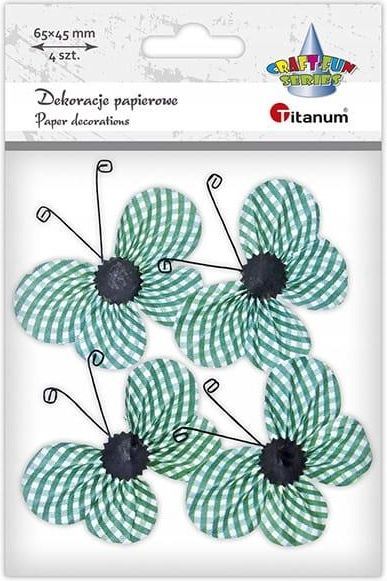 Aplikacje papierowe Motyle zielone 3D 65 x 45 mm 4 sztuki, Craft-Fun Dekoracje samoprzylepne papierowe, wzór: motyle, czułki z drucika, wymiar: 65 x 45 mm, kolor: biało-zielona kratka. 4 sztuki. Kod produktu w systemie: - 5903714538034