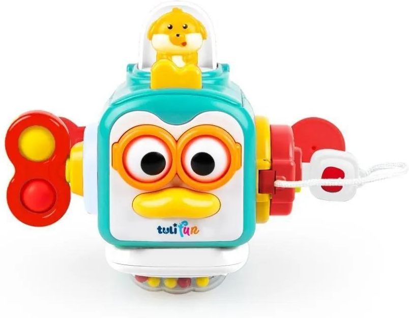Klik, klik, co się wydarzy, gdy przekręcisz kluczyk lub gdy naciśniesz guziczek? Turkusowy pingwinek w kształcie kostki zabawi maluszka na wiele sposobów, gdyż każda z jego ścianek to inna, sensoryczna zabawa! Znajdziemy tu pieska, wyskakującego z klapki, króliczka na przesuwanym pasku, obrotową …