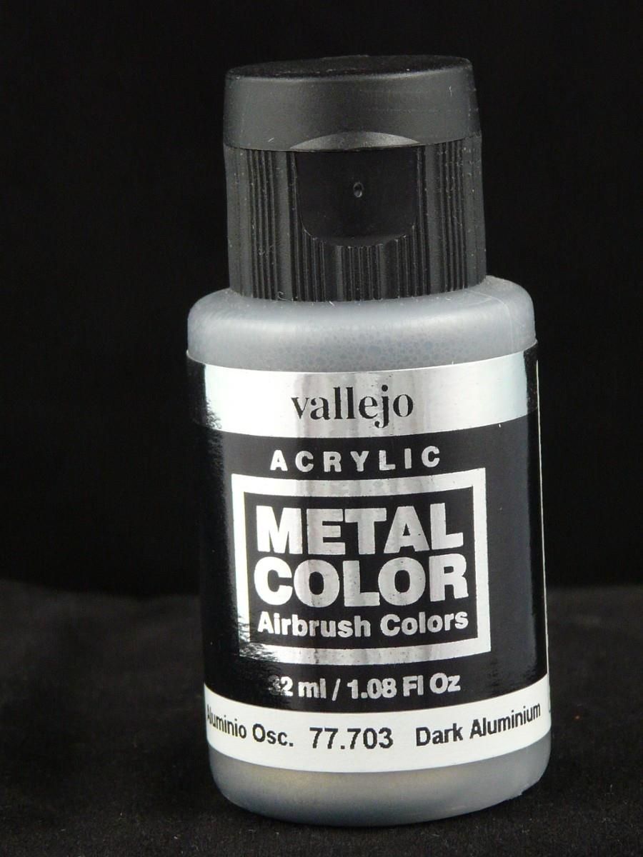 Vallejo 77703 - Farba akrylowa Metal Color. Dark Aluminium Buteleczka o pojemności 32 ml, zawiera farbę akrylową metaliczną z serii Metal Color do malowania aerografem lub pędzlem. Farby Vallejo z serii METAL COLOR Metal Color to innowacyjna gama kolorów metalicznych z formułą na bazie wody, która w swoim składzie ma pigmenty aluminiowe o wyjątkowej odporności i przyczepności do tworzyw sztucznych i metalu. Farby te mogą być nakładane bezpośrednio na model, bez potrzeby gruntowania, jednak znacznie lepszy efekt daje zastosowanie czarnego błyszczącego podkładu (Vallejo Gloss Black Primer 77660). Metal Color schnie bardzo szybko, jednak dla uzyskania pełnej twardości malowanej powierzchni zaleca się, aby poczekać kilka godziny od jej nałożenia.