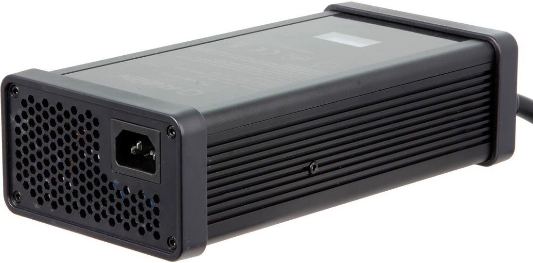 Ładowarka do akumulatorów Li-ION 4SL 14,8V 30A 600W GDPT G600-168030 (obudowa aluminiowa) z wyświetlaczem LCD G600 to ładowarka dużej mocy (600W max.) do pakietów akumulatorów (4SL) wykonanych w technologii Li-ION. Jest to inteligentna ładowarka sterowana mikroprocesorem MCU z 4-stopniową kontrolą ładowania, dla ochrony akumulatorów przed przeładowaniem. Posiada zdefiniowane automatyczne fazy ładowania CC-CV. Ładowarka odpowiednia jest do ładowania akumulatorów z 4 ogniw połączonych w szereg, czyli pakietów litowo-jonowych o zakresie napięciowym 10V(min) - 16,8V(max). Ładowarka może być podłączona bezpośrednio do gniazda AC 100V - 240V na całym świecie, za pomocą przewodu zasilającego. Urządzenie charakteryzuje się wysoką wydajnością, długą żywotnością i niezawodnością. Obudowa z aluminium, lepiej odprowadza ciepło a wbudowany wentylator obniża temperaturę. Na obudowie ładowarki zamontowano czytelny wyświetlacz LCD. Odpowiada on za wskazanie aktualnego napięcia i prądu dostarczanego przez ładowarkę, czasu ładowania i pojemności akumulatora. Urządzenie wykorzystuje algorytm Coulomba do dokładnego obliczania pojemności akumulatora. Wbudowany algorytm, może dokładnie przewidzieć poziom naładowania akumulatora (SoC). Urządzenie posiada automatyczne ograniczenie prądowe oraz temperaturowe i limit czasu ładowania, co wpływa na bezpieczeństwo użytkowania. Wbudowany port USB-mini umożliwia podłączenie do komputera i komunikację z urządzeniami zewnętrznymi poprzez magistralę CAN lub standard RS485. Mikroprocesorowa kontrola pracy ładowarki Aluminiowa obudowa (lepiej odprowadza ciepło) Wbudowany wentylator do aktywnego chłodzenia Doskonała ochrona: odwrotnej polaryzacji (wyjście), niskiego napięcia zasilania, pojemności i czasu pracy Wbudowana aktywna funkcja PFC (Power Factor Correction) – korekcja współczynnika mocy Kontrola SoC (Security Operations Center) - poziom naładowania akumulatora Wykorzystuje algorytm Coulomba do pomiaru pojemności akumulatora Zabezpieczenie przed zwarciem, przepięciem, nadmierną temperaturą Wbudowana 4-stopniowa kontrola ładowania dla akumulatorów litowych (wstępne ładowanie-CC-CV) Czytelny wyświetlacz LCD pokazujący aktualnie dane Sprawność konwersji energii do 94% Wbudowany port USB-mini umożliwia podłączenie do komputera Dane techniczne Model: G600-168030 Napięcie wejściowe: 100-240V AC 50/60Hz 6,8A Napięcie wyjściowe: 14,8V (dla 4 ogniw w szeregu) Zakresy napięciowe: 10,0V - 16,8V Technologia ładowanych ogniw: litowo-jonowe (Li-ION) Obsługiwana pojemności pakietu: 60 ~ 200Ah (4 ogniwa litowo-jonowe) Prąd wyjściowy: 30A ±10% Prąd odcięcia: ≤3A ±20% Moc znamionowa: 600W Efektywność: 90% Całkowicie automatyczne fazy ładowania: CC,CV Temperatura pracy: -10°C ~ 40°C Temperatura przechowywania: -40°C ~ 70°C Wbudowany bezpiecznik: 15A/ 250V Obudowa: tworzywo sztuczne Wymiary: 240 x 115 x 65mm Waga brutto: 2061g Dokumentacja techniczna EN Certyfikat bezpieczeństwa CB/IEC Certyfikat zgodności CE z dyrektywą Niskonapięciową LVD