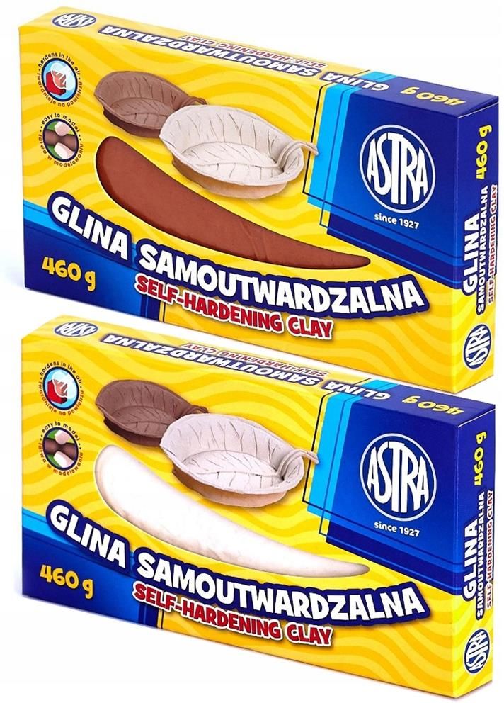 2 x glina samoutwardzalna biała + brązowa Astra 2 x 460g ZESTAW - 2x Glina samoutwardzalna biała + brązowa. Idealna do wykonywania małych form: figurki, płaskorzeźby na płytkach oraz biżuteria (broszki, korale, wisiorki). Glina twardnieje na powietrzu. Po wyschnięciu gliny samoutwardzalnej przedmioty można malować farbami np. ASTRY. ___ Producent Polska firma Astra S.A., która już od ponad 90 lat jest dostawcą najwyższej jakości produktów plastycznych, piśmiennych oraz tekstylnych.