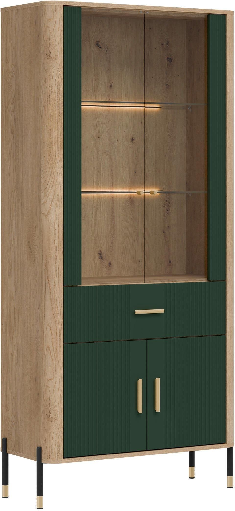 Liveo Witryna Wysoka Dante Dt14 4D1S Dąb Cremona Torro / Zielony Mat Złoty Uchwyt 187Cm Rzgów