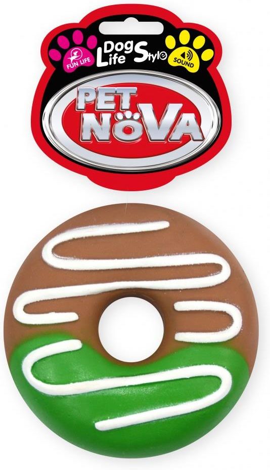 Pączek Donut z polewą 10cm Zabawki gumowe marki PET NOVA wykonane są z trwałej i wytrzymałej gumy winylowej.Jaskrawe kolory oraz bardzo szczegółowe malowanie przyciąga uwagę psa i zachęca do zabawy. Zabawki te są przeznaczone dla każdej grupy wiekowej psa - Puppy, Junior, Adult, Senior (szczeniak, Junior, Dorosły, Senior). W zależności od poszczególnych cech zabawki PET NOVA pomagają w nauce aportowania, masują dziąsła psa, lub są przeznaczone do zabawy z przysmakami. Co oznaczają loga na etykiecie PET NOVA (pogrubiona czcionka oznacza cechy produktu): SOUND - zabawka po ugryzieniu wydaje dźwięk, co zachęca psa do dalszej zabawy FUN LIFE - zabawka zapewnia dobrą zabawkę dla psa oraz jego właściciela,idealna do aportownia SNACK LIFE - zabawka do zabawy z przysmakami,ze specjalnym miejscem na włożenie przysmaków DENTAL - zabawka masująca dziąsła, dodatkowa hiegiena jamy ustnej Każda zabawka z tej serii posiada 2 cechy których opis znajduje się powyżej, przed zakupem sprawdź jakie specjalne cechy ma Twoja zabawka marki PET NOVA. Cechy produktu: Wiek psa: Puppy, Junior, Adult, Senior (szczeniak, Junior, Dorosły, Senior) Wielkość rasy psa: Małe 4-10kg, Duże 10-20kg, Bardzo duże powyżej 20kg Waga: ok. 50 g Długość: ok. 10,5 cm Szerokość: ok. 10,5 cm Wysokość: ok. 3,5 cm Materiał: Guma winylowa