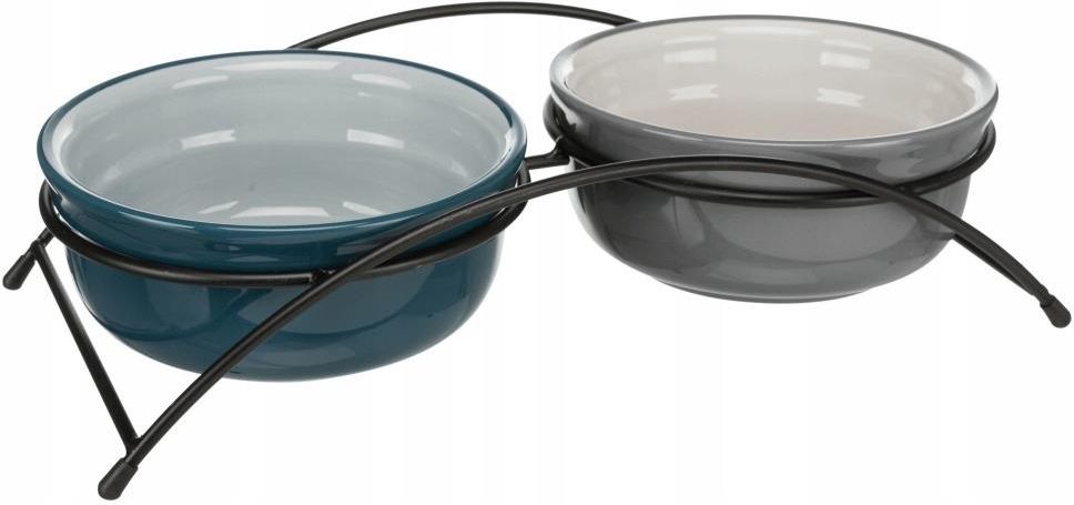 TRIXIE Zestaw misek ceramicznych na stojaku Jeśli jesteś właścicielem psa, to wiesz jak ważne jest, aby Twój pupil miał wygodne i estetyczne naczynia do jedzenia i picia. Doskonały wybór dla tych, którzy chcą zapewnić swojemu psu najlepsze warunki do jedzenia. Miski są trwałe, łatwedoczyszczenia i bezpieczne dla Twojego pupila. Metalowy stojak zapewnia stabilnośćnaczyń i chroni je przed przewracaniem się. Miski są także bardzo stylowe i nadają się do każdego wnętrza. Ciesz się spokojem wiedząc, że Twój pies ma wszystko, czego potrzebuje. 2 miski ceramiczne na stojaku Stojak metalowy malowany proszkowo, czarny Antypoślizgowe gumowe nóżki Wymiary: 2 × 1,6 l/? 20 cm Kolor: petrol/jasny petrol/szary/jasnoszary Zawiera: 2 szt. Trwałość: Miski ceramiczne jest trudniej uszkodzić niż plastikowe, co zmniejsza ryzyko połknięcia niebezpiecznych kawałków. Higiena: Łatwość do utrzymania w czystości. Ponadto, powierzchnia ceramiczna nie zatrzymuje zapachów tak jak plastik. Ergonomia: Miski na stojaku zapewniają wygodniejszą pozycję dla psa podczas jedzenia lub picia. To może być szczególnie korzystne dla psów z problemami z kręgosłupem lub stawami, którzy potrzebują wygodniejszej pozycji podczas jedzenia. Estetyka: Schludny estetyczny wygląd, eleganckie połączenie ceramiki i metalu.