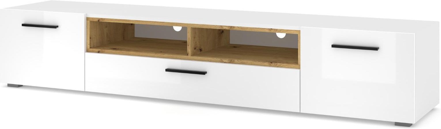 Szafka RTV ANETTE K 198 biały połysk / dąb artisan Atrakcyjna i przestronna szafka pod telewizor w naturalnej kolorystyce, świetna do salonu. Posiada trzy zamykane schowki oraz miejsce na dekoder lub konsole, z otworem na kable. Dodatkowego uroku dodaje szafce wstawka w modnym kolorze dębu artisan oraz kontrastowe czarne uchwyty. Opis: Posiada trzy zamykane schowki (dwie boczne i jeden środkowy) Posiada dwie otwarte półki (środkowe) Posiada otwór na kable Czarne uchwyty Telewizor do 90 cali Kolorystyka: (korpus / front / wstawka) biały mat / biały połysk / dąb artisan - dotyczy tej aukcji czarny mat / czarny mat / dąb artisan Wykorzystane materiały: Płyta laminowana 16 mm (korpus i fronty) Obrzeża PVC Płyta HDF (plecy) Wymiary: Szerokość: 198 cm Wysokość: 37 cm Głębokość: 43 cm Wysokość otwartej półki: 13 cm Szerokość otwartej półki: 49 cm Ta aukcja dotyczy wersji szafki Anette: szerokość 198 cm, kolor: biały mat / biały połysk / dąb artisan. Pozostałe prezentowane wersje są do kupienia na osobnych aukcjach. Kolorystyka do wyboru: czarny mat / czarny mat / dąb artisan biały mat / biały połysk / dąb artisan Meble nowe, oryginalnie zapakowane. Wysyłane w paczce (podwójne pakowanie premium) do samodzielnego montażu.