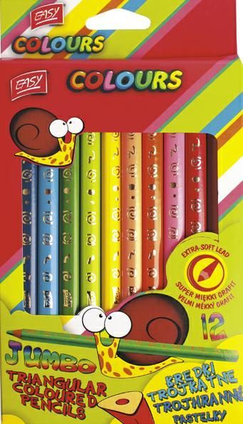 KREDKI TRÓJKĄTNE JUMBO 12KOL Stawiaj na kreatywność i rozwój swojego dziecka, pozwól mu tworzyć niezwykłe rysunki z kredkami trójkątnymi Easy. Kredki trójkątne jumbo, 12 kolorów Zestaw kredek trójkątnych wykonanych z drewna. Gama 12 żywych, intensywnych kolorów. Radość tworzenia Pomagaj swojemu dziecku rozwijać wyobraźnię i zdolności manualne. Rysowanie jest jednym z najlepszych sposobów na ćwiczenie kreatywności oraz sprawności nadgarstka. Dodatkowo jest to czynność, którą dzieci wręcz uwielbiają!Gama 12 żywych kolorów pomaga tworzyć wspaniałe dzieła, jak również pozwala na pierwsze eksperymenty z mieszaniem i zestawianiem barw.Trójkątny kształt kredek ułatwia ich wygodne uchwycenie, jest również oryginalny i przyciąga dziecięcy wzrok. Jumbo Rozmiar jumbo oznacza grubszy korpus, dzięki któremu dzieciom- w szczególności młodszym – łatwiej jest uchwycić kredkę. Siła prostoty Kredki są jednym z najprostszych narzędzi wspomagających rozwój kreatywności, dlatego od lat cieszą się bardzo dużą popularnością. Aby uzyskać cienką, precyzyjną linię, wystarczy naostrzyć grafit. Dzięki optymalnej twardości, doskonale służą również do wypełniania kształtów.