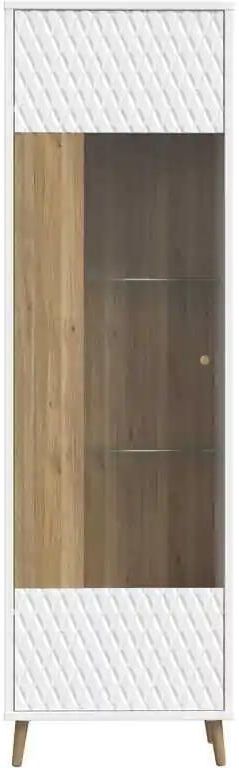 Wąska witryna Aksana stanowi bardzo elegancki dodatek do wystroju wnętrza utrzymanego w stylu nowoczesnym, skandynawskim czy loftowym. Mebel nawiązuje subtelnie do szykownego charakteru aranżacji w stylu glamour, jednak nie przytłacza pomieszczenia nadmiernie wyrafinowanym designem. Jego atut stanowią między innymi wysokie drewniane nóżki oraz ozdobny ryflowany front w kolorze czystej bieli, który wyróżnia tę kolekcję na tle innych modnych propozycji. Dlaczego warto wybrać nowoczesną witrynę Aksana? Elegancka witryna do salonu jest tym, na co goście przyjmowani w pokoju dziennym najczęściej zwracają swoją uwagę. Nic w tym dziwnego, bowiem ten przeszklony mebel ma co do zasady pełnić rolę reprezentacyjną, eksponując piękne kryształy, rodzinne pamiątki czy bibeloty. Nowoczesna witryna Aksana sama w sobie dodaje aranżacji eleganckiego charakteru. Pełni jednocześnie funkcję użytkową i dekoracyjną, stanowiąc wyjątkowo gustowne miejsce do przechowywania niezbędnych przedmiotów. Jakie zalety ma witryna szklana Aksana? Prezentowany model witryny nie zajmuje wiele miejsca, a dzięki uniesieniu jego bryły na wysokich nóżkach daje wrażenie lekkości i nie obciąża optycznie aranżacji niewielkiego salonu. Mebel oferuje zamknięte półki do przechowywania przedmiotów, które pragniemy ukryć przed wzrokiem gości. Natomiast w części przeszklonej pozwala wyeksponować to, co ma pełnić rolę dekoracyjną. Witryna szklana do salonu może zostać wyposażona również w nowoczesne oświetlenie, co pozwoli podkreślić jej ozdobny charakter. Wymiary witryny Szerokość: 59,8 cm Głębokość: 41,3 cm Wysokość: 199,8 cm