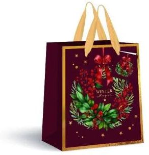 Średnia torebka prezentowa o wymiarach 26,5 x 33 x 13 cm to praktyczny i estetyczny sposób na zapakowanie upominku. Występuje w ciemnym, bordowym kolorze z dodatkiem czerwieni, zieleni i złota, czyli typowych kolorów świątecznych. Torebka jest wykonana z solidnego papieru, a wzmocnione uchwyty …