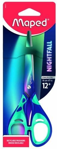 Nożyczki szkolne 16 cm Nightfall Maped Nożyczki z kolekcji Nightfall. Długość 16 cm. Ostrza wykonane ze stali nierdzewnej pokryte grafikami w kolorze zielono-granatowo-różowym. Miękkie wewnątrz, symetryczne uchwyty. Urzekająca kolekcja Nightfall produkty przygotowane z myślą o wymagających …
