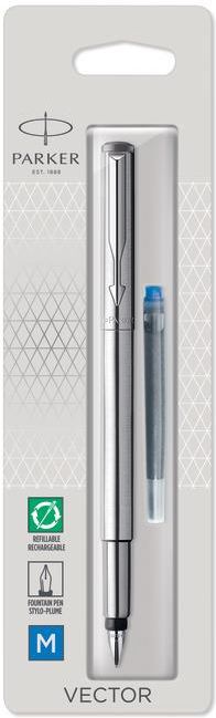 Nowoczesny model pióra Parker Vector dedykowany jest osobą młodym, wchodzącym w dorosłe życie. Idealnie wpisuje się w warunki życia studenckiego oraz biurowego. Polecany jest dla uczniów, absolwentów, studentów i osób poszukujących lub rozpoczynających pierwszą pracę.Stalowe pióro wykonane z materiałów najwyższej jakości zdobione jest chromowaną strzałą w formie klipu - charakterystycznego akcentu marki Parker. Posiada stalówkę wykonaną ze stali nierdzewnej w rozmiarze M oraz nabój w kolorze niebieskim.