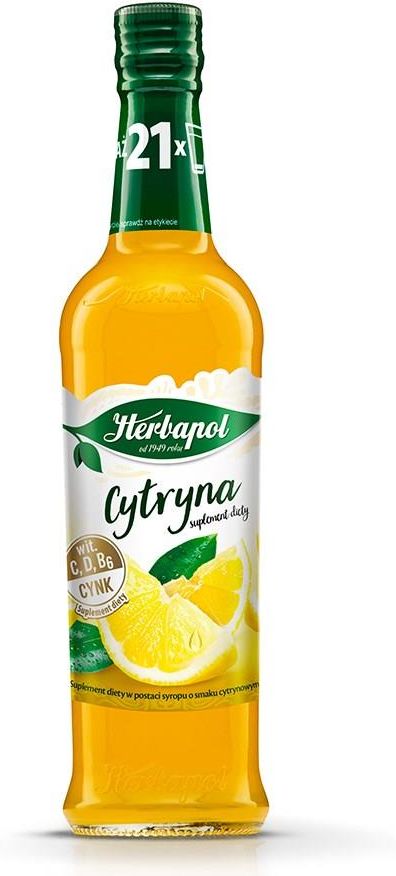 Herbapol Syrop Cytryna suplement diety 420ml Opis produktu Suplement diety w postaci syropu o smaku cytrynowym, pasteryzowany. Tajemnica pysznego smaku syropów Herbapol tkwi w recepturze opartej na długoletnim doświadczeniu oraz starannie dobranych składnikach. Witaminy: C, B6, D oraz cynk pomagają w prawidłowym funkcjonowaniu układu odpornościowego. Korzystny efekt wynikający z deklarowanego działania występuje w przypadku spożycia 40 ml produktu. Nie stosować u osób uczulonych na którykolwiek ze składników produktu. Produkt nieodpowiedni dla diabetyków. Nie należy przekraczać zalecanej porcji do spożycia w ciągu dnia. Produkt nie może być stosowany jako substytut (zamiennik) zróżnicowanej diety. Zrównoważona i zróżnicowana dieta oraz zdrowy styl życia są podstawą zapewnienia prawidłowego funkcjonowania organizmu. Przechowywać w zamkniętym opakowaniu w temperaturze pokojowej, w sposób niedostępny dla małych dzieci. Chronić od światła. Po otwarciu przechowywać w szczelnie zamkniętej butelce w lodówce nie dłużej niż 30 dni. Zmiana barwy syropu w trakcie przechowywania wynika z zawartości naturalnych składników i nie stanowi wady produktu. Składniki Cukier, woda, zagęszczony sok cytrynowy (0,2%) o ekstrakcie ogólnym 56%, regulator kwasowości: kwas cytrynowy, barwnik: karoteny, witamina C, witamina D, witamina B6, cynk, aromat. Wartość odżywcza w 100 ml: Wartość energetyczna 1086 kJ/ 256 kcal, tłuszcz 0 g, w tym kwasy tłuszczowe nasycone 0 g, węglowodany 64 g, w tym cukry 64 g, białko 0 g, sól 0 g. Wartość odżywcza w 40 ml: Wartość energetyczna 434 kJ/ 102 kcal, tłuszcz 0 g, w tym kwasy tłuszczowe nasycone 0 g, węglowodany 26 g, w tym cukry 26 g, białko 0 g, sól 0 g. Zawiera znikome ilości tłuszczu (w tym kwasów tłuszczowych nasyconych) i białka. Produkt zawiera 17 zalecanych dziennych porcji suplementów. Dzienna porcja produktu (40 ml) zawiera: Witamina C: 24 mg (30% RWS*), Witamina D: 2,5 µg (50% RWS*), Witamina B6: 0,84 mg (60% RWS*), Cynk: 6 mg (60% RWS*). *RWS – referencyjna wartość spożycia Sposób przygotowania 20 ml (2 łyżki stołowe) syropu spożyć po rozcieńczeniu z wodą (200 ml). Spożywać 2 razy dziennie. We współpracy z naturą