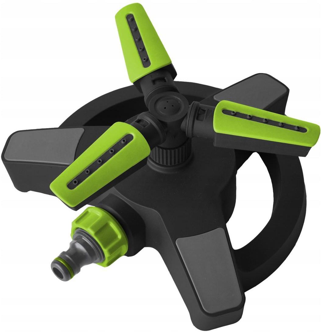 Zraszacz obrotowy trójramienny na podstawie Zraszacz obrotowy trójramienny na podstawie to jeden z typów zraszaczy, który jest wykorzystywany do równomiernego nawadniania dużych powierzchni trawnika czy ogrodu. Dzięki swojej konstrukcji oraz mechanizmowi obrotowemu, zraszacz ten może pokrywać duży obszar, zapewniając optymalne nawilżenie ziemi bez konieczności ręcznego przestawiania urządzenia. Podstawa: Zraszacz jest zamocowany na stabilnej podstawie, która została wykonana z trwałego plastiku. Podstawa ta zapewnia zraszaczowi stabilność na różnorodnych powierzchniach, co jest kluczowe dla równomiernego rozprowadzania wody. Ramię obrotowe: Trzy ramiona zraszacza są równomiernie rozmieszczone wokół centralnego punktu. Każde ramię jest wyposażone w dysze, które rozpylają wodę podczas obrotu urządzenia. Mechanizm obrotowy: Serce zraszacza, które umożliwia obracanie się ramion. Działa on zazwyczaj na zasadzie ciśnienia wody, które napędza ramiona do obrotu, co pozwala na szerokie rozproszenie wody na zraszanym obszarze. Parametry Kolory dominujące: czarny, szary, zielony. Materiał: ABS, TPR. Każde ramię jest wyposażone w dyszę. Zalety Użyte materiały gwarantują solidność, trwałość oraz lekkość. Kompatybilność - możemy go łączyć z produktami innych marek.
