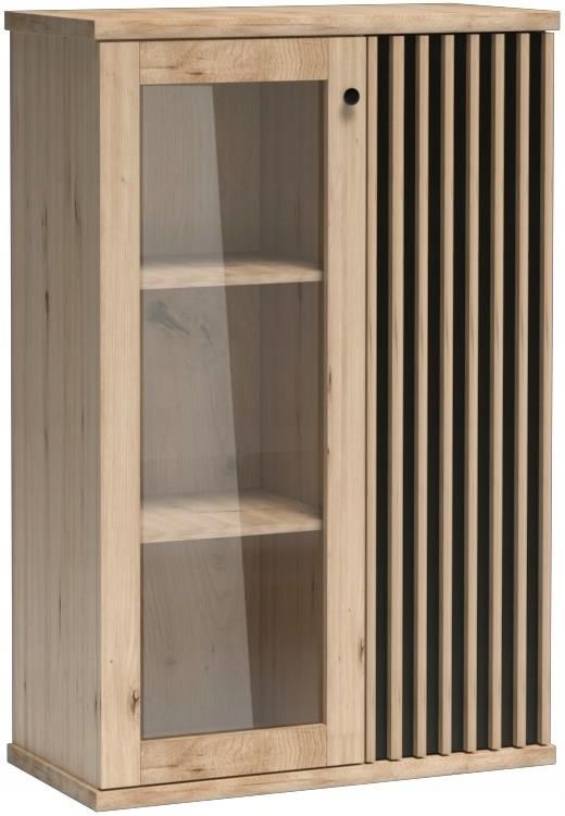 Nowoczesna, niewysoka witryna dwudrzwiowa z lamelami CALI, polskiego producenta JARSTOL. Elegancka i funkcjonalna, wykonana z laminowanej płyty meblowej w kolorze dąb artisan. Witryna posiada 2 części. Po lewej stronie znajdują się 2 półki zamykane przeszklonymi drzwiczkami. Również prawa strona posiada 2 półki, zamykane drzwiami z lamelami. W witrynie zastosowano system metalowych zawiasów z cichym domykiem. Produkt dostępny jest w wersjach z nóżkami, bez nóżek oraz wersjach z półkami LED oraz bez tych półek DANE TECHNICZNE: Wymiary: 131,9 x 86,4 x 40,6 cm (wys./szer./gł.) Materiał: laminowana płyta meblowa, płyta HDF, lamel(listwa MDF) okleina ABS, metal, szkło Rozwiązania: 2 półki(lewa strona), 2 półki(prawa strona), cichy domyk, czarne metalowe nóżki 10 cm(opcja dodatkowa), półki LED(opcja dodatkowa) Kolor: dąb artisan, czarny Gwarancja: 2 lata Produkt do samodzielnego montażu * Ze względu na różne ustawienia urządzeń elektronicznych na których oglądamy produkty, odcień kolorystyczny może się delikatnie różnić.