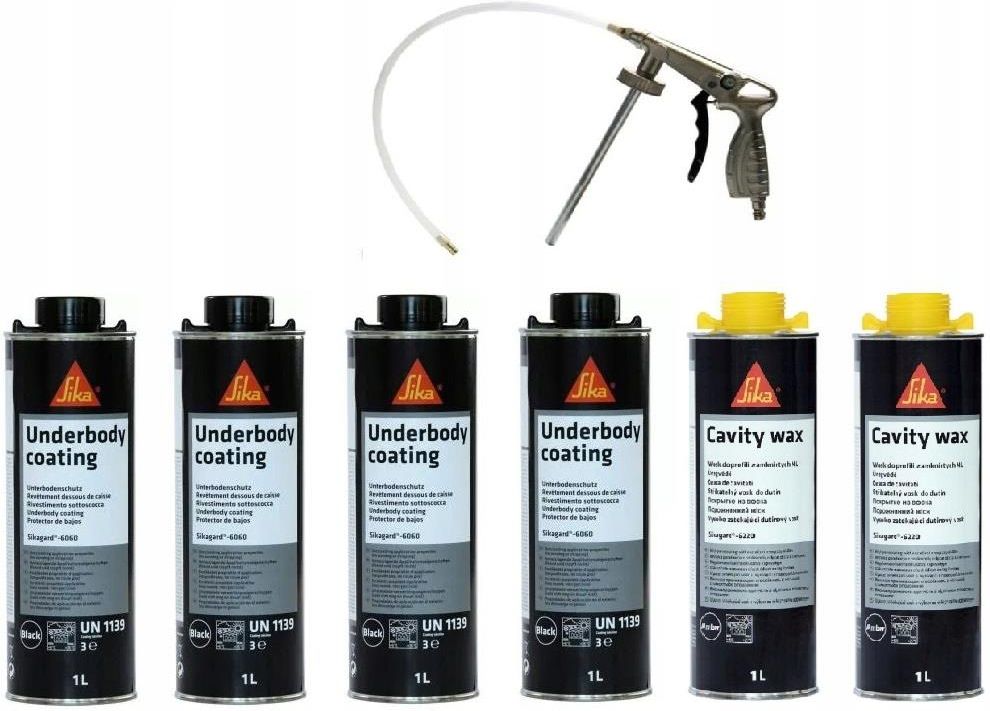 SIKA SIKAGARD 6060 KONSERWACJA PODWOZIA 4x1L + 6220 WOSK DO PROFILI + PISTOLET UBS Z WĘŻYKIEM Opis produktu: SikaGard® -6060 to trwała, tiksotropowa warstwa ochronna na bazie bitumu, o doskonałych właściwościach antykorozyjnych i wygłuszających. Skutecznie chroni podwozie pojazdu, jest wyjątkowo łatwa w użyciu i ma doskonałe właściwości użytkowe. Po wyschnięciu tworzy trwałą warstwę chroniącą metal przed korozją. SikaGard® -6060 jest produkowany zgodnie z Systemem Zarządzania Jakością i Środowiskiem według norm ISO 9001/14001 oraz programem „responsible care”. Opis produktu: SikaGard® -6220 to trwały wosk w kolorze bursztynowym o doskonałych właściwościach antykorozyjnych. Skutecznie chroni profile podwozia pojazdu, jest łatwy w użyciu i ma wyjątkowe właściwości penetrujące doskonale zabezpieczając nawet trudno dostępne obszary i wąskie szczeliny, drobne rysy. Po wyschnięciu tworzy brązową, lekko lepką warstwę wosku chroniącą profile przed korozją.